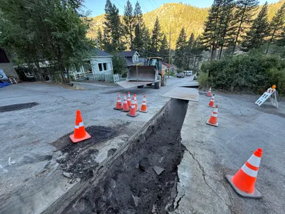 pavement next to excavated trench sunny with natural daylight open and accessible trench next to roadway