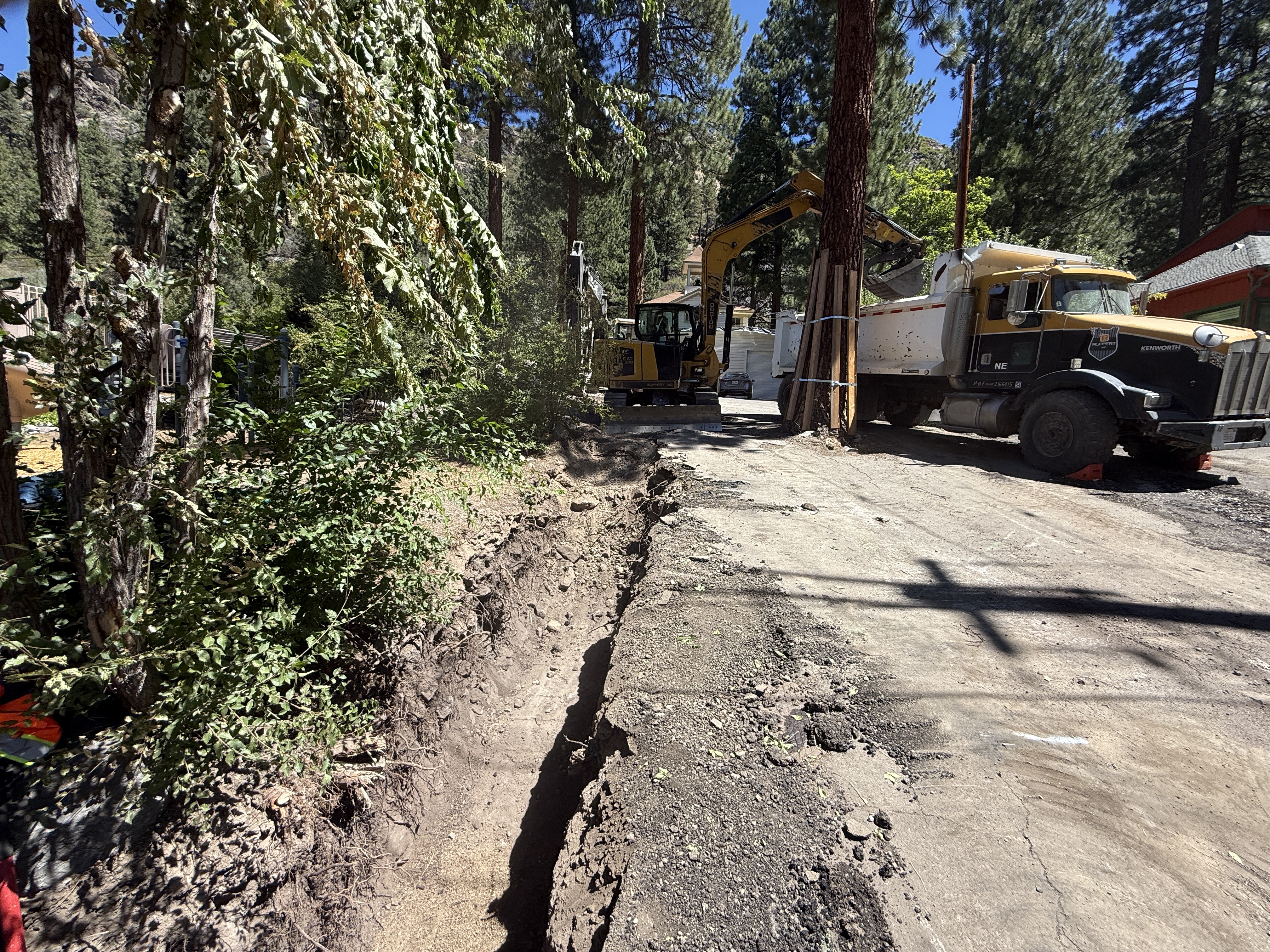 The image shows an ongoing trenching operation alongside a dirt and gravel road in a wooded area. An excavator is positioned near the trench and is actively engaged in the earthmoving process. Next to the excavator, a dump truck is parked on the road. The trench appears to be recently excavated with no visible piping or components installed yet. Trees and natural vegetation surround the work area, suggesting a rural setting.