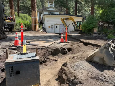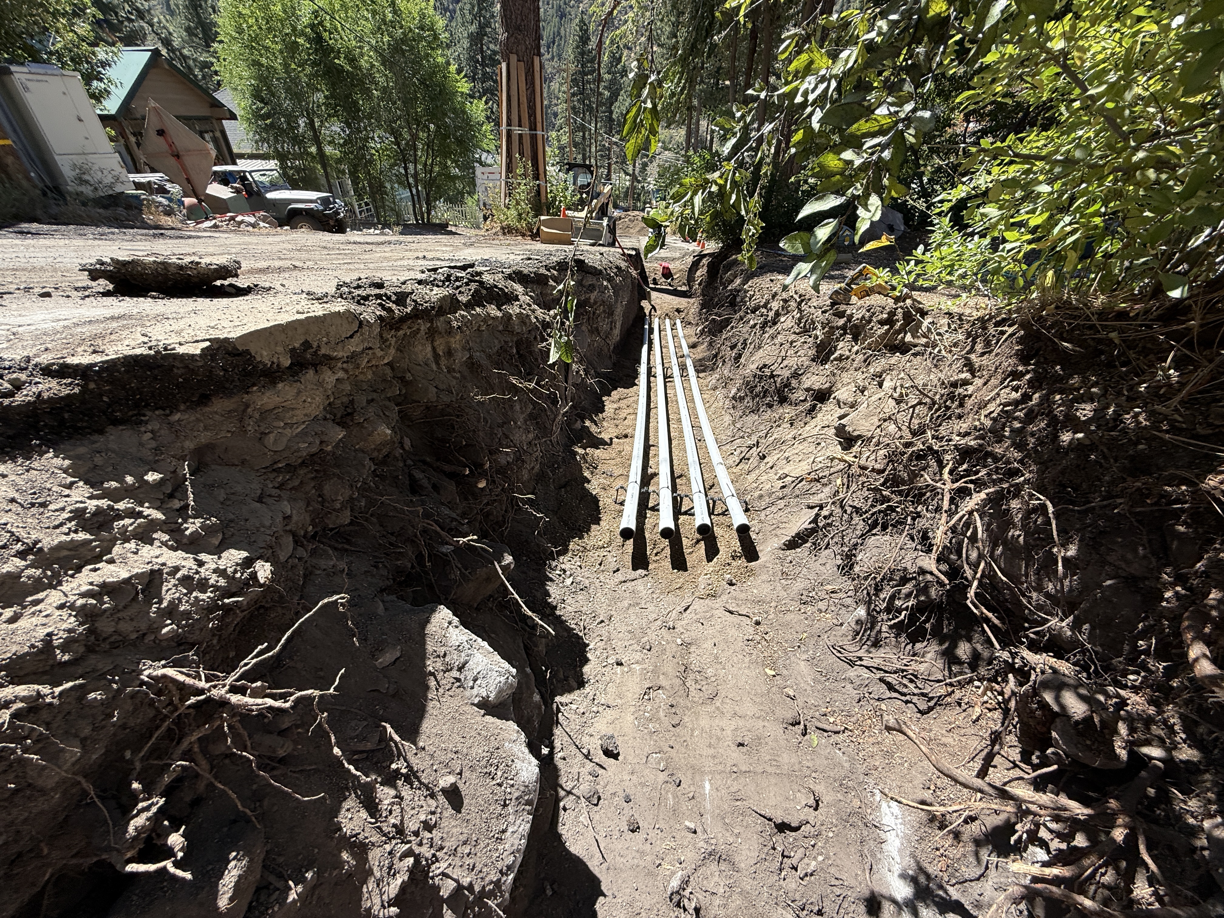 The image shows a trench with at least four conduit pipes laid inside. The trench is dug through what appears to be an unpaved dirt area with visible root exposure on the sides. A construction site with a building and vehicles is visible in the background, suggesting ongoing work activities. The pipes appear aligned parallel along the trench's length.