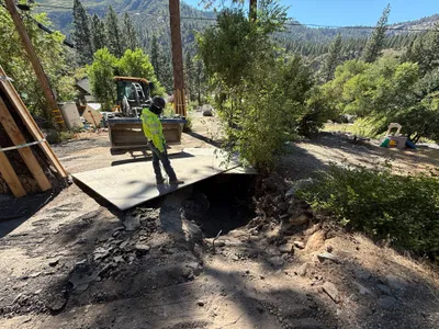 exposed dirt and roots in trench sunny with shadows open area with visible access