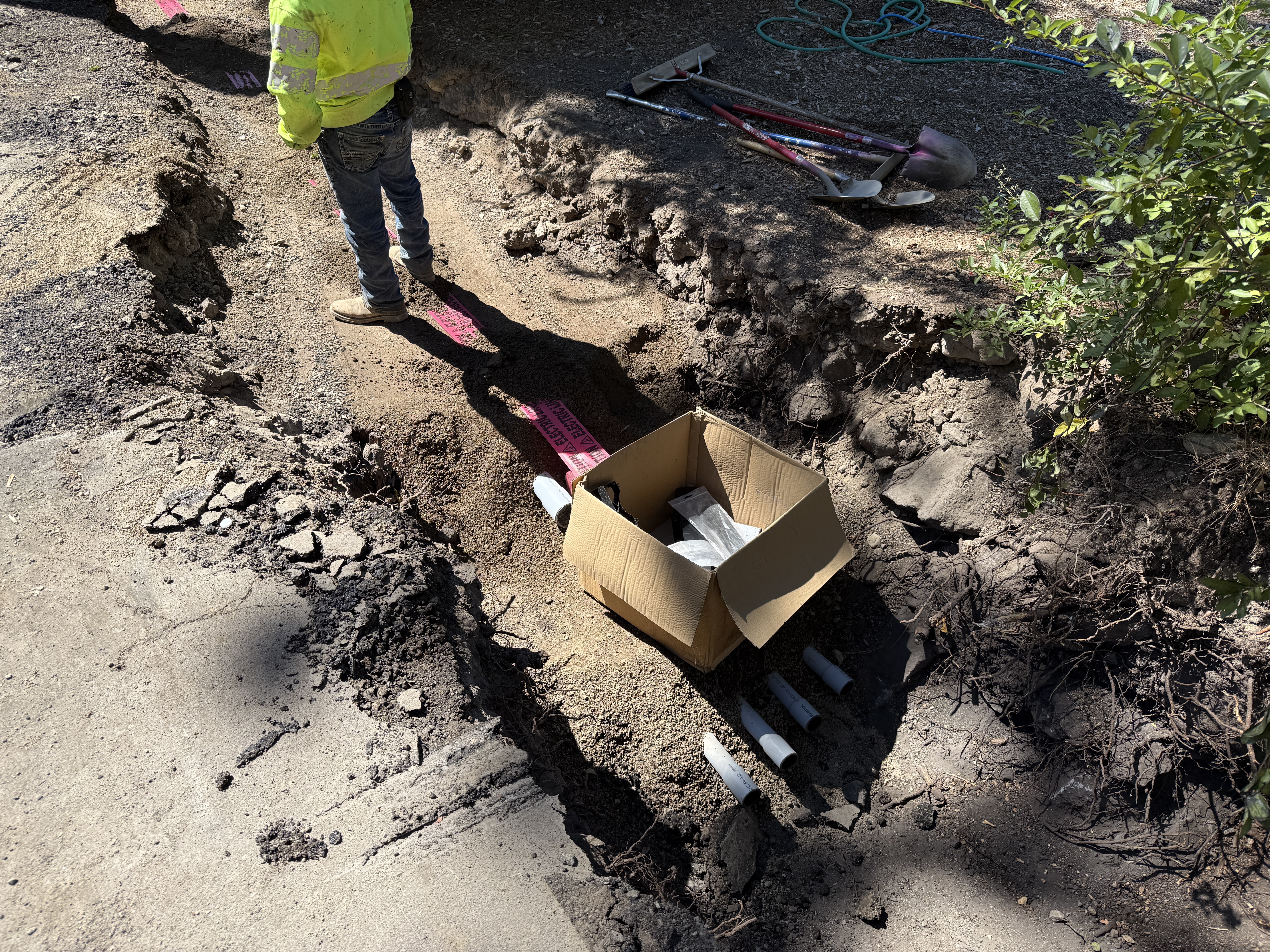 A trench is dug along a path with a worker standing inside. Three pipes protrude from the trench, with a cardboard box sitting next to them containing some materials. Shovels and a hose are visible on the ground above the trench. The ground appears to be dirt and there are broken pieces of pavement nearby.