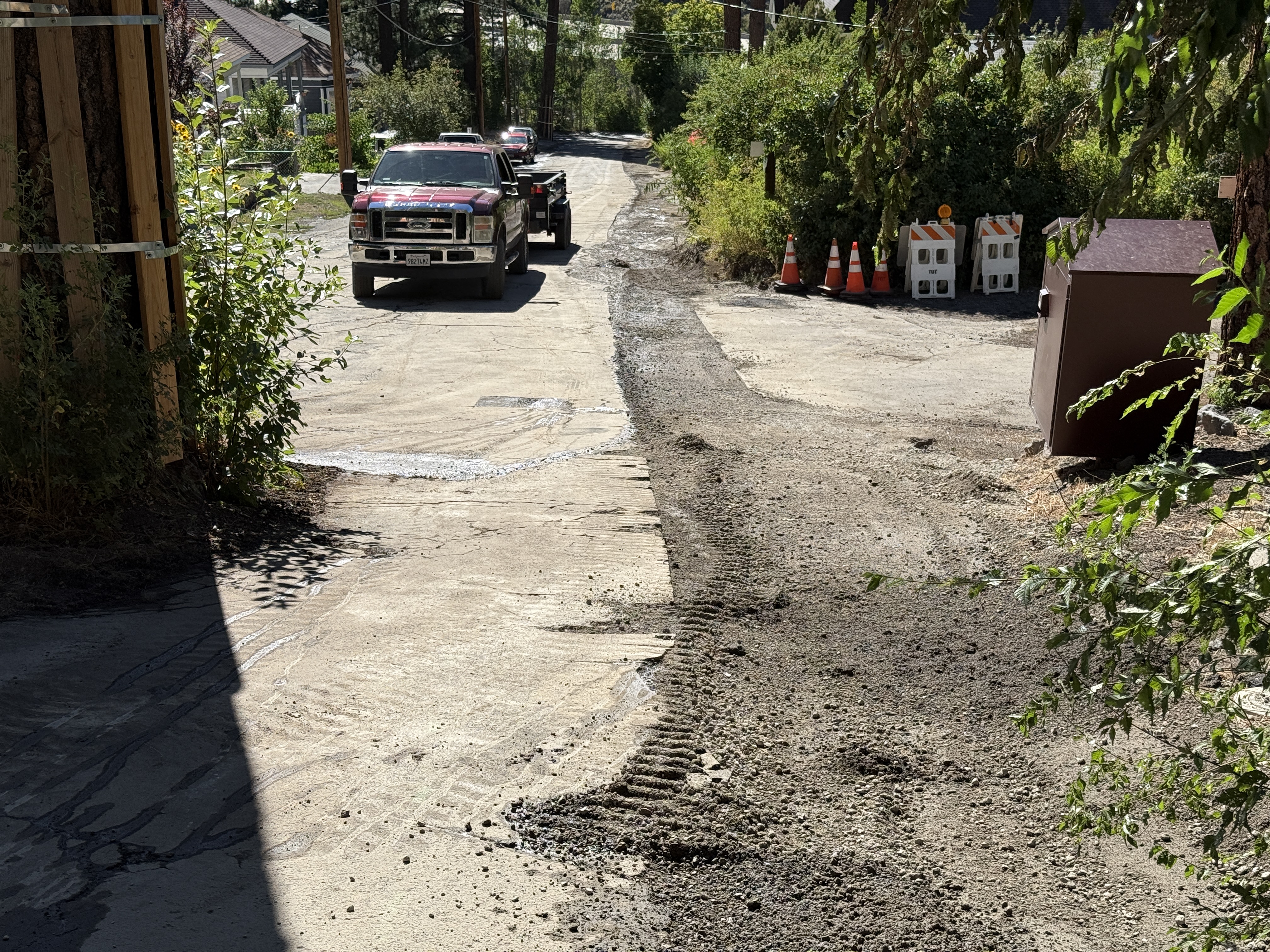 A pickup truck with a trailer is parked on a partially paved surface. Orange traffic cones and barriers are positioned on the right side of the road, suggesting ongoing work. The surface appears uneven with some dirt and loose gravel present, indicating possible road repair or paving activities. Vegetation is visible along the edges, and the lighting suggests a sunny day.