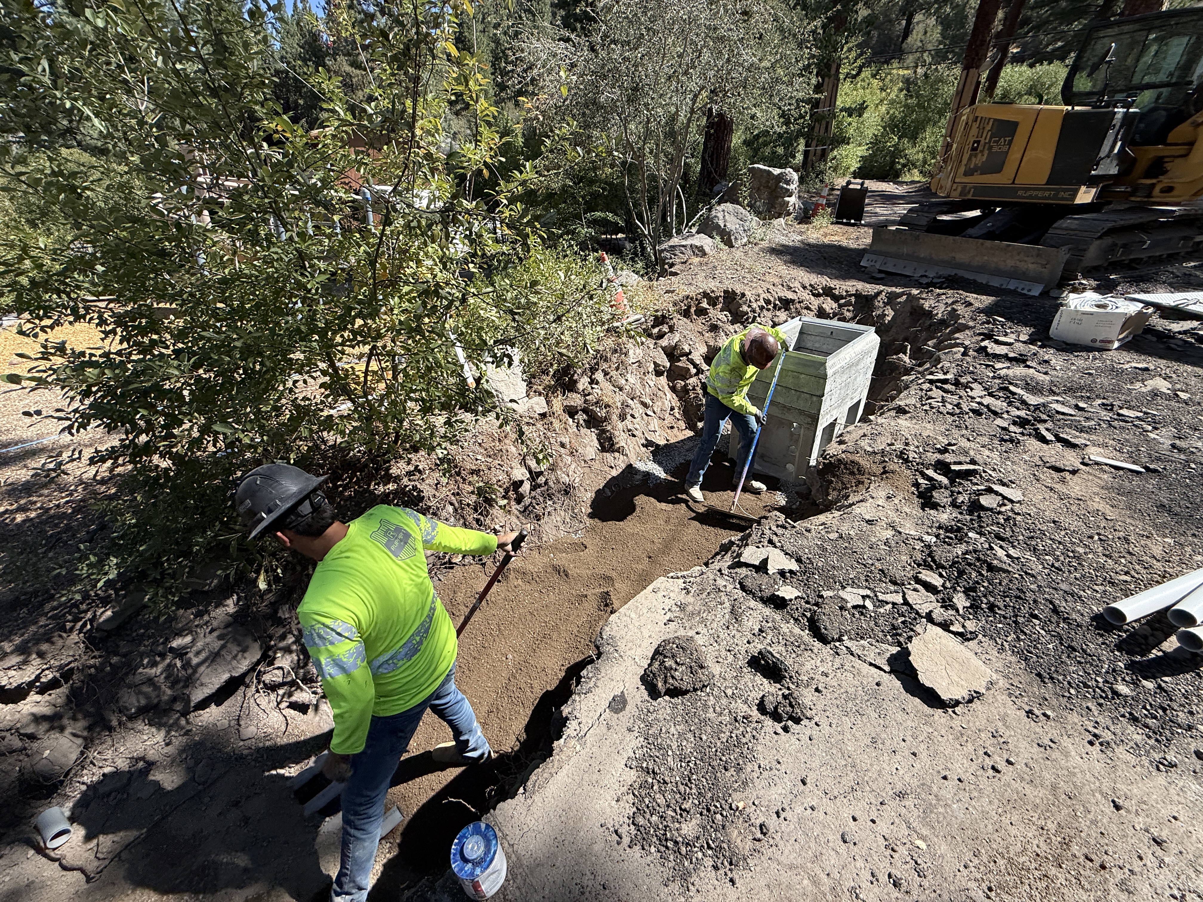 The image shows two workers in a trench, one using a shovel to level the ground near a partially installed concrete structure, like a catch basin or vault. A yellow tracked excavator is parked nearby on a dirt surface. The trench is partially backfilled, with loose soil and some PVC pipes visible at the edge of the trench. The workers are wearing high-visibility vests and hard hats, indicating adherence to safety protocols.