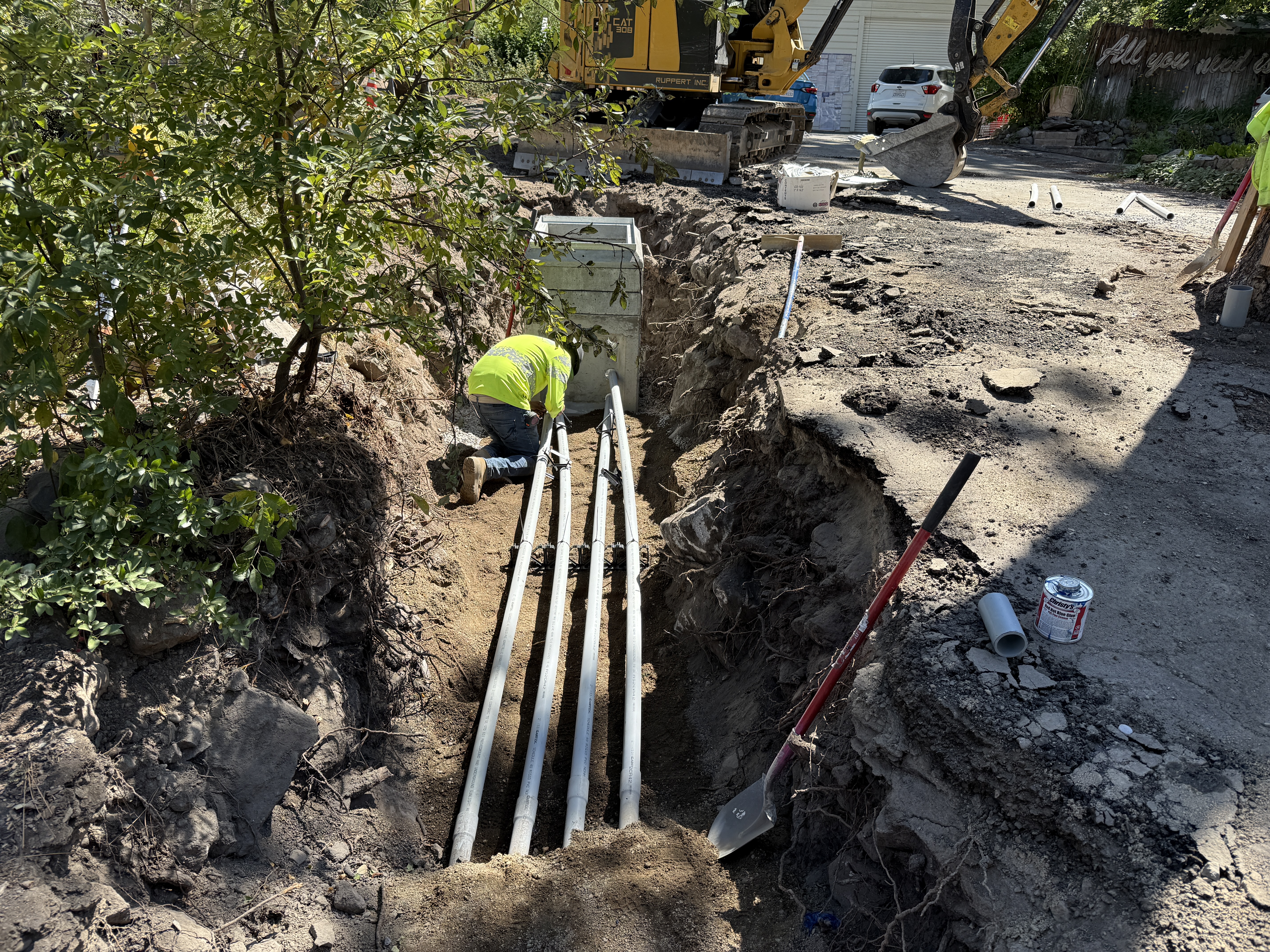The image shows a person in a hi-vis vest working in a trench with several conduits laid in the trench. An excavator is visible in the background, and a worker is positioned near a utility box at the end of the conduits. The terrain is uneven with exposed soil and some scattered tools visible.