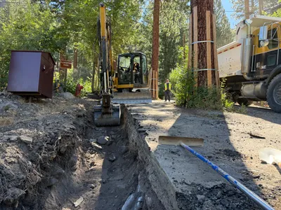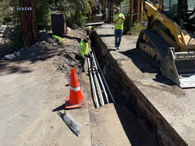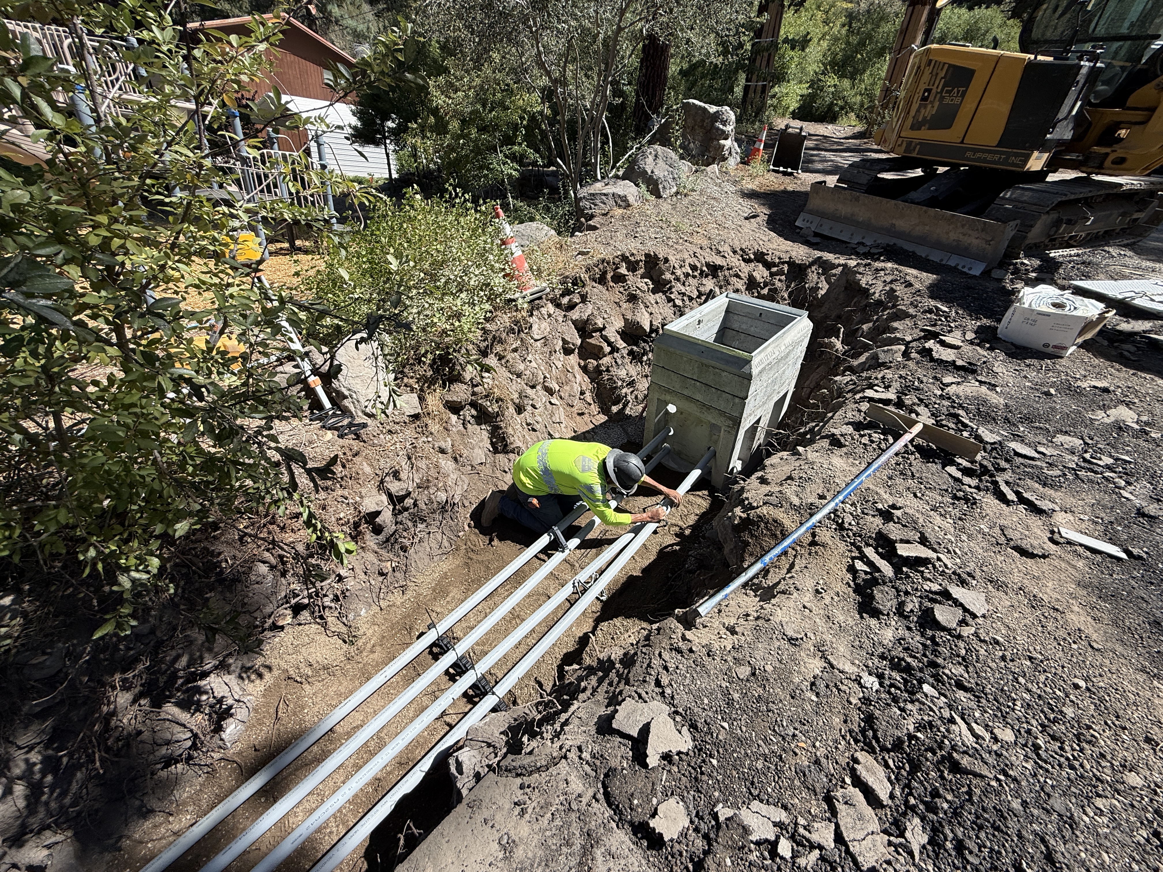 A construction worker in a high-visibility vest and hard hat is in a trench installing or assembling conduit pipes into a concrete utility box. Five gray conduit pipes are seen entering the box. An excavator is parked near the trench, while the surrounding area includes rocky soil and vegetation. Safety cones are visible near the work area.