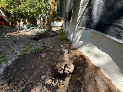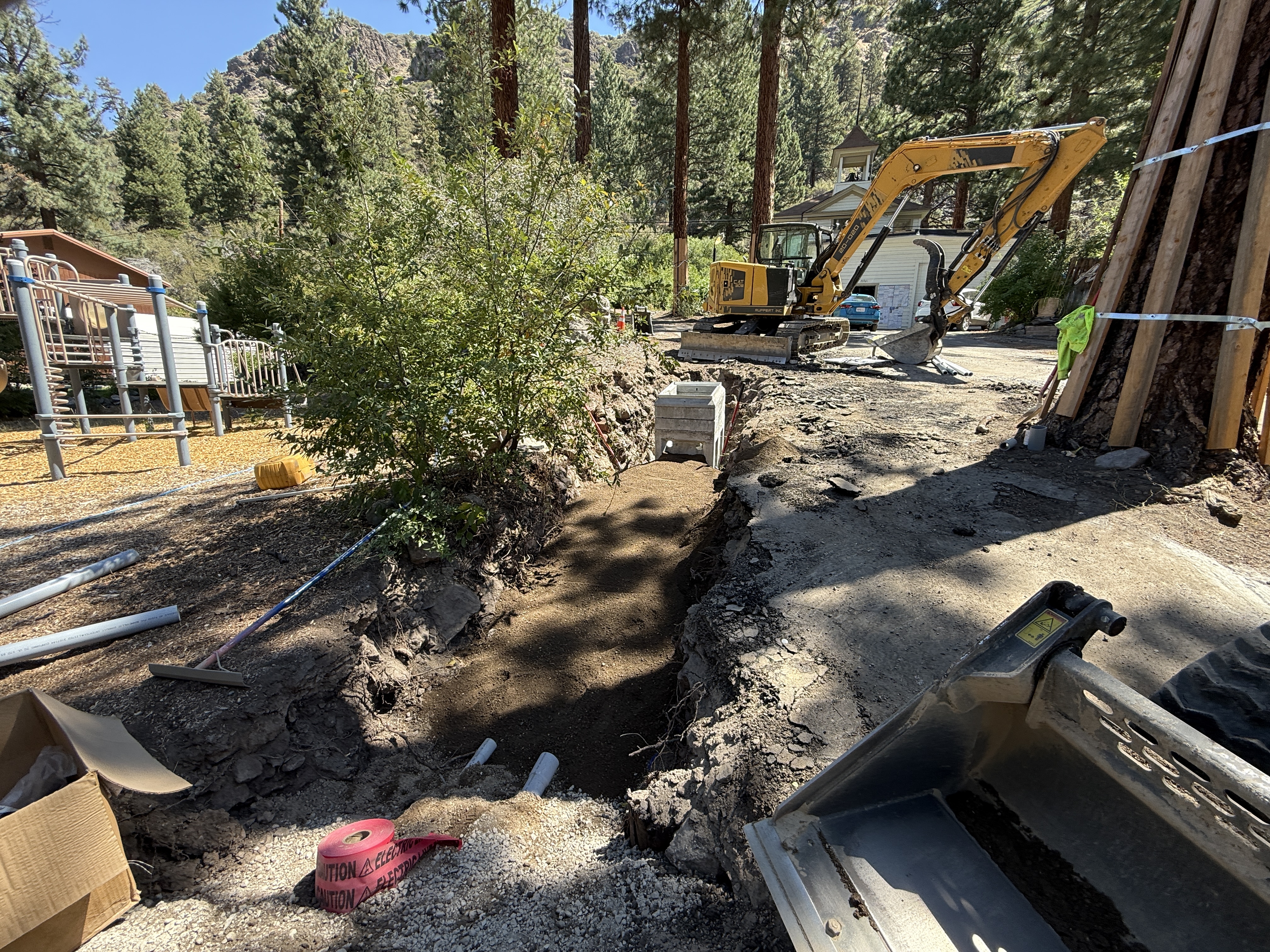 An open trench runs through the center of the image, primarily showing excavation work with a backhoe in the background. Pipes and construction materials are staged alongside the trench. Caution tape is visible, indicating a work zone. A playground structure is nearby, suggesting that the site may be in a public or communal area.