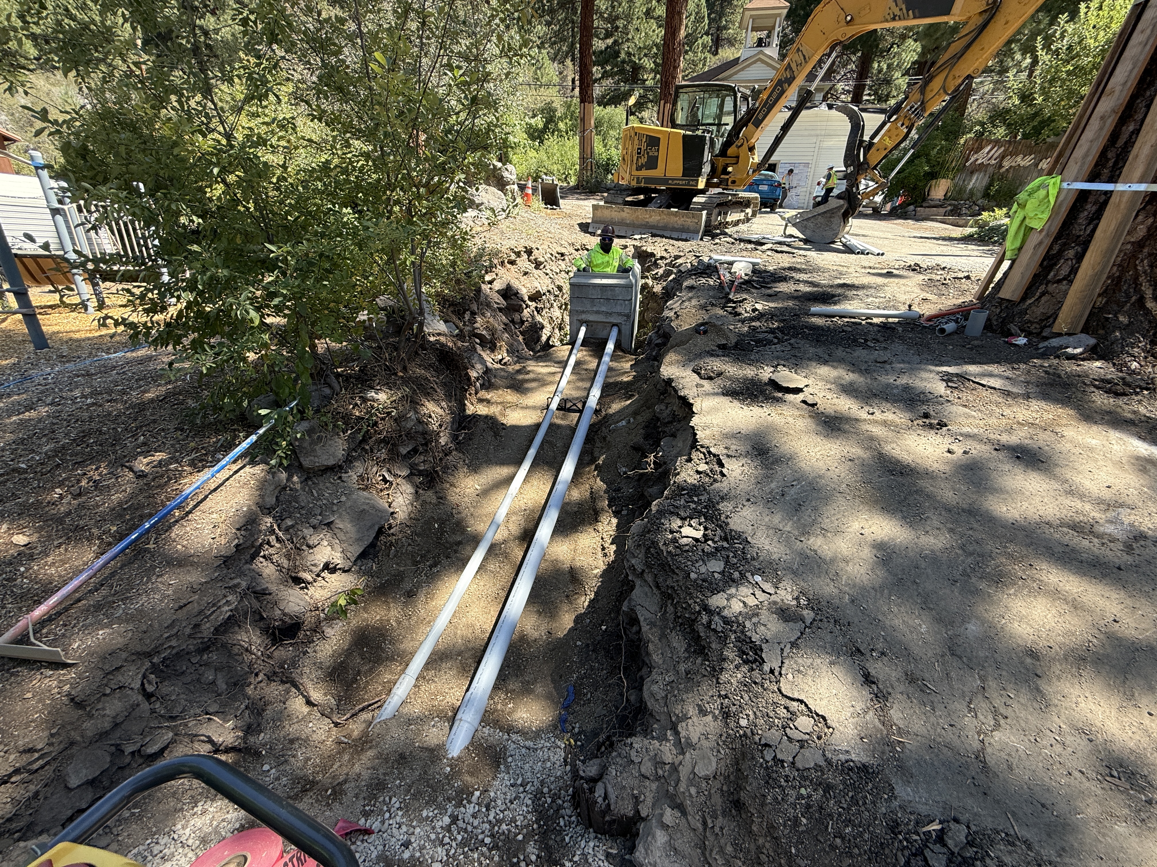 The image shows trenching activity with an excavator in use. Two conduits are placed within a trench that runs parallel to a tree line. A worker is visible in the trench wearing PPE. The site appears to be on uneven ground with exposed soil.
