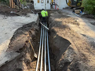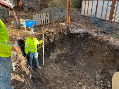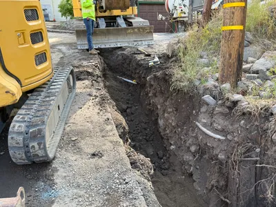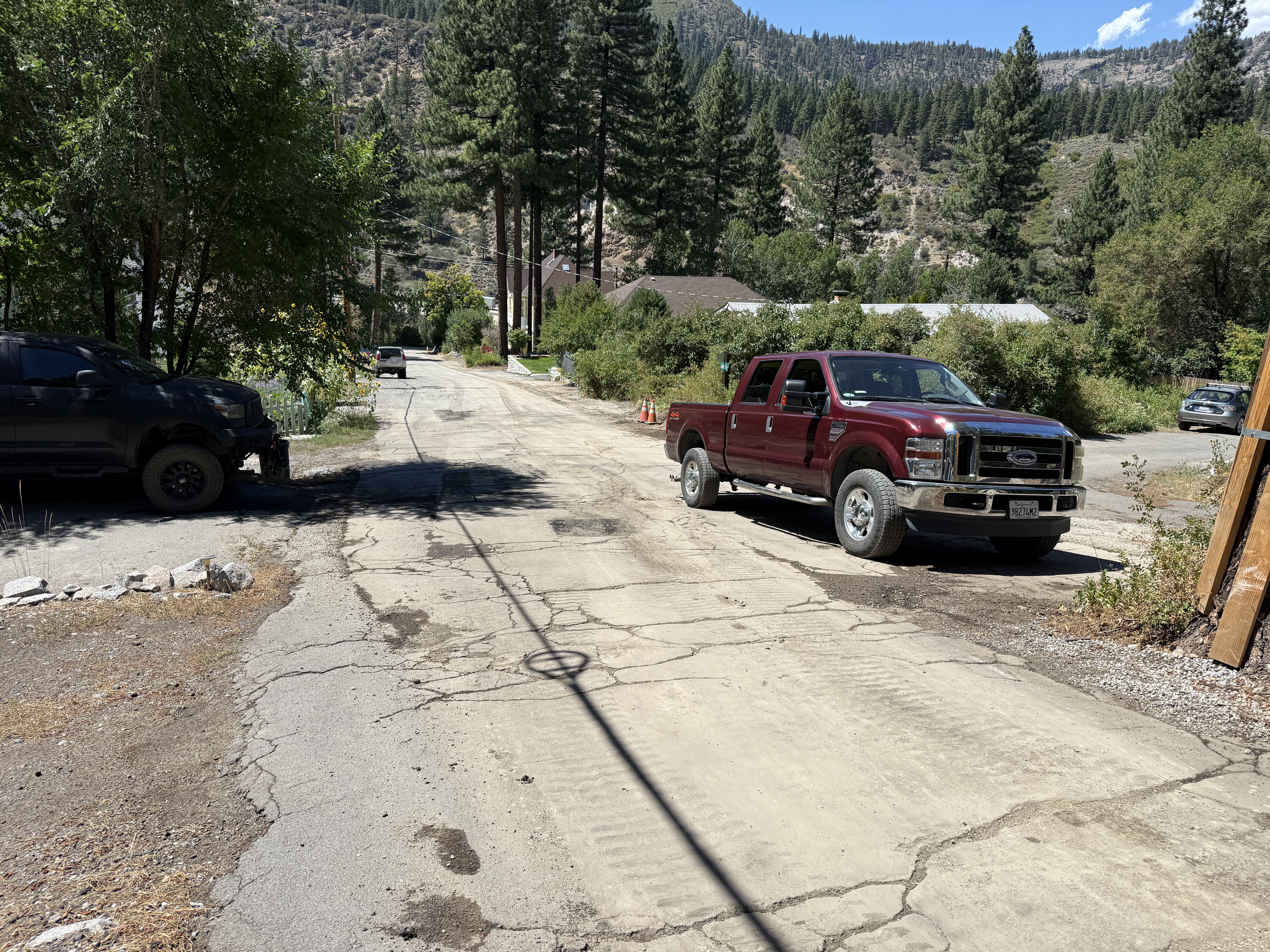 The image shows a small road in a rural area with vehicles parked along the sides, including a red pickup truck on the right. The background includes trees and hilly terrain. No active construction work or materials are visibly staged in the frame. The surface appears to be damaged pavement.