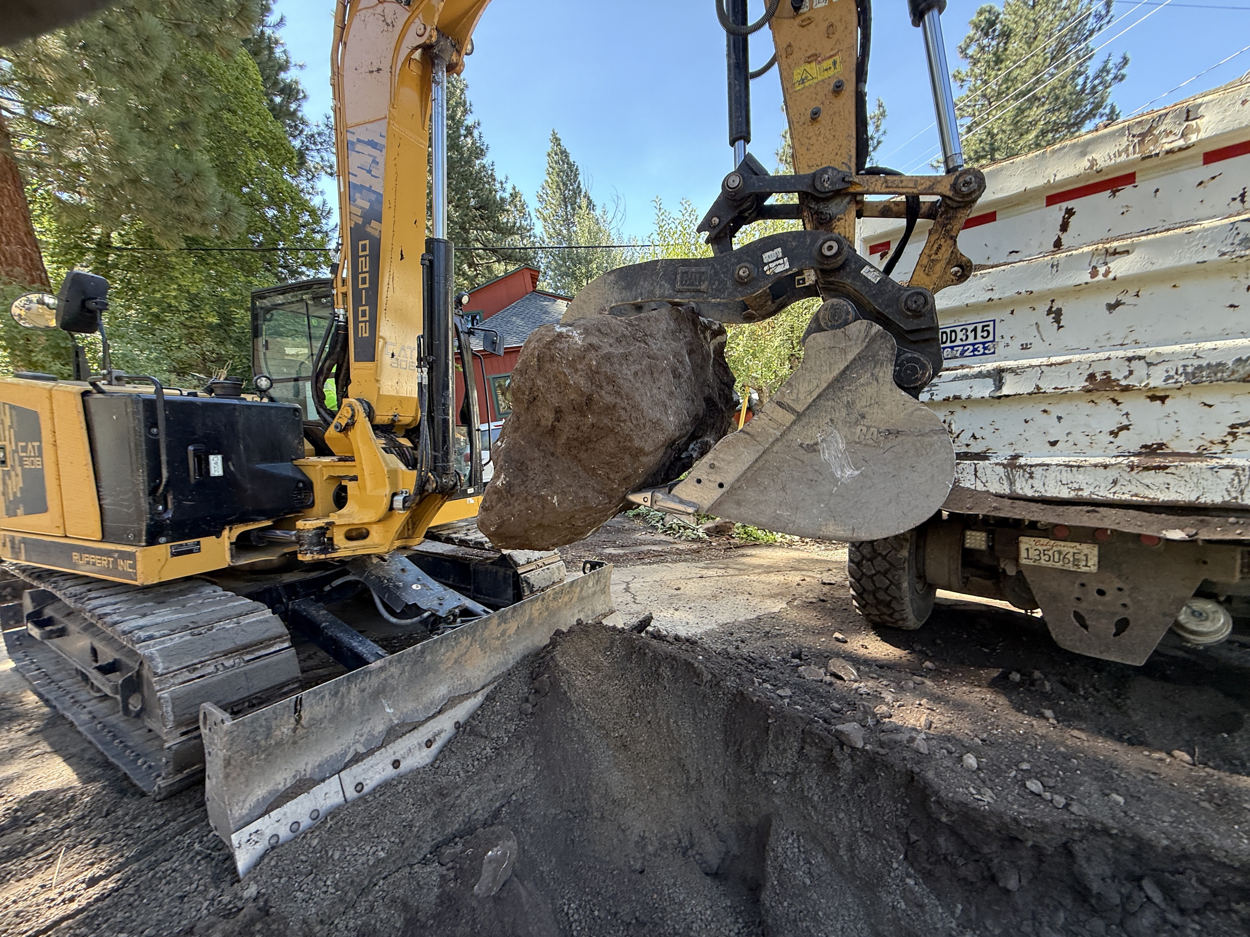 The image shows an excavator lifting a large rock and placing it into a dump truck. The excavator is stationed to the left and is actively engaged in moving materials. The dump truck is located on the right. A trench appears in the foreground, suggesting excavation activities.
