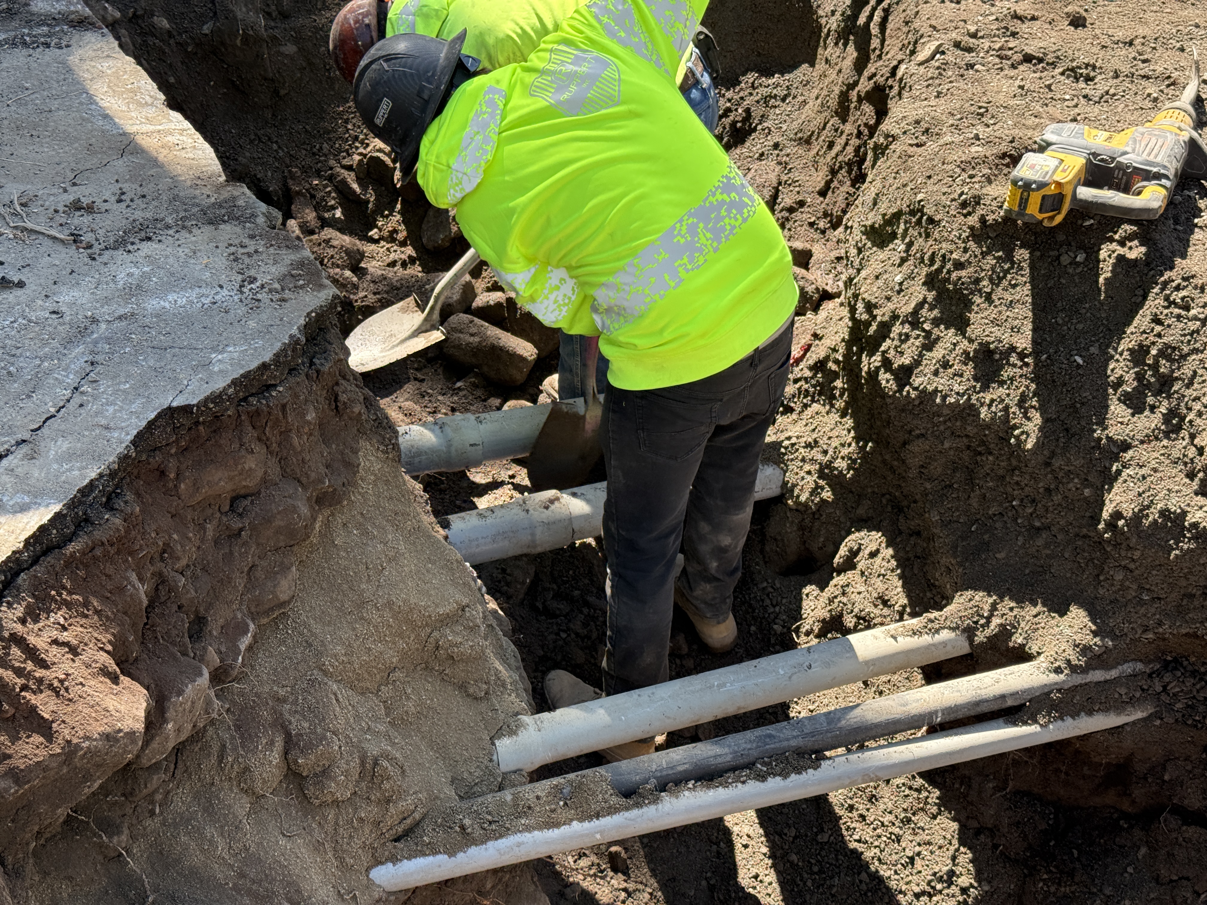 The image shows two workers in a trench working on or around a series of exposed pipes or conduits. The workers are wearing high-visibility clothing and hard hats. A drill is visible on the right side of the trench. The soil is disturbed and the trench appears open with uneven surfaces.