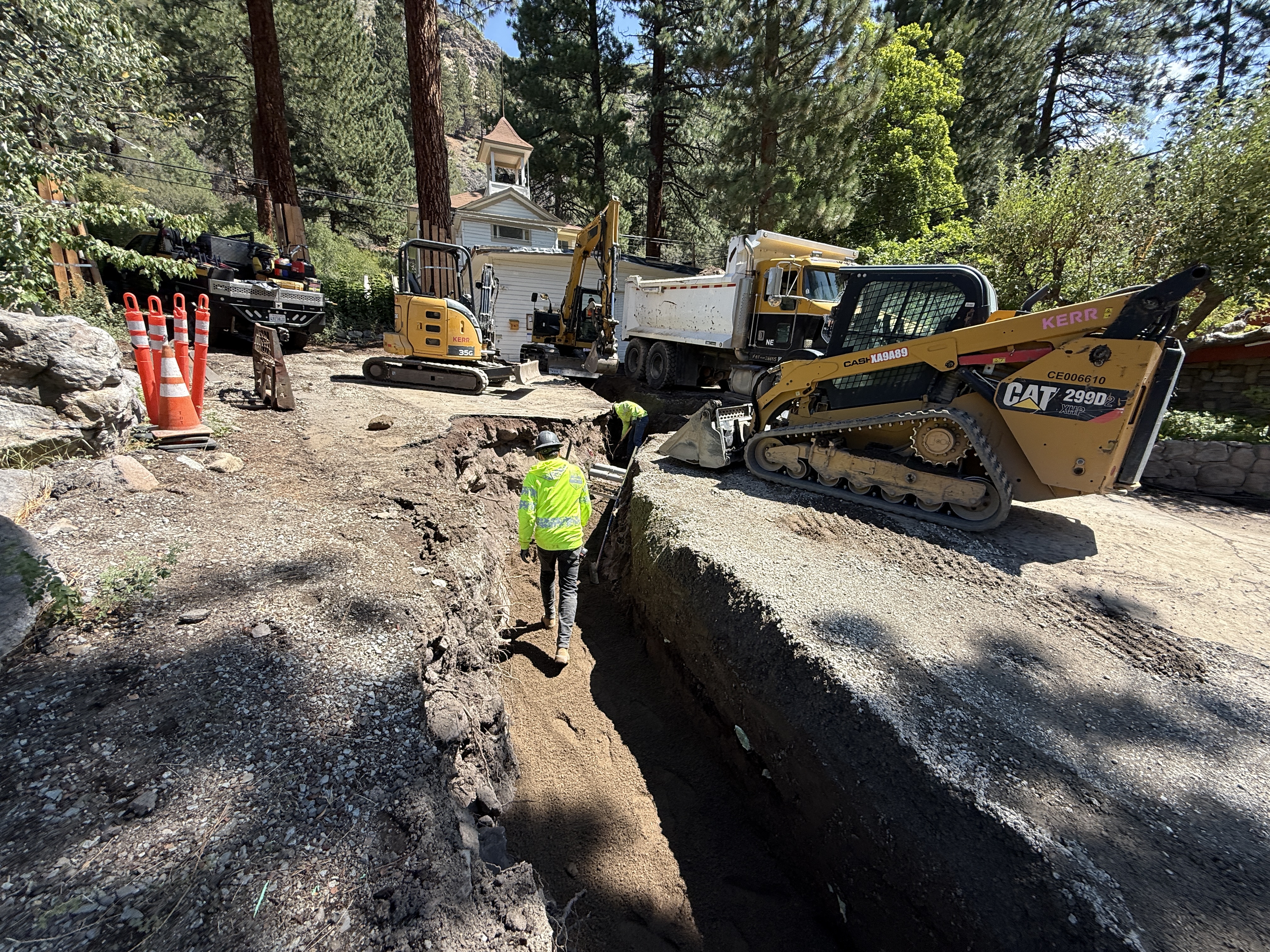 Safety cones are visible along with PPE worn by workers, highlighting awareness of open trench hazards.