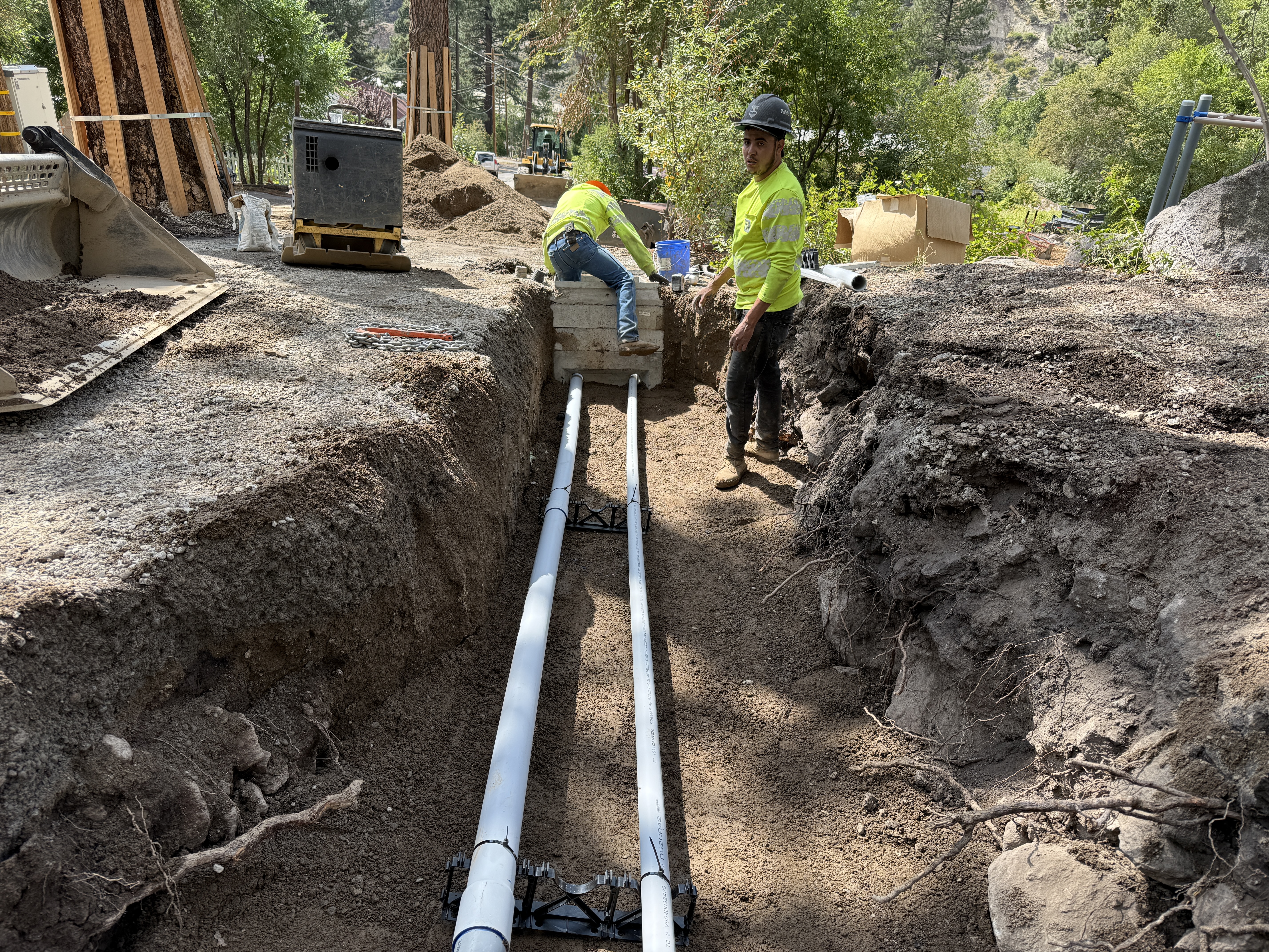 The image shows a trench with two workers present at the site. Two PVC pipes are laid down parallel in the trench. A worker is standing while another is kneeling at the end of the trench. There are construction tools and materials around the trench area. This appears to be part of a duct bank installation.