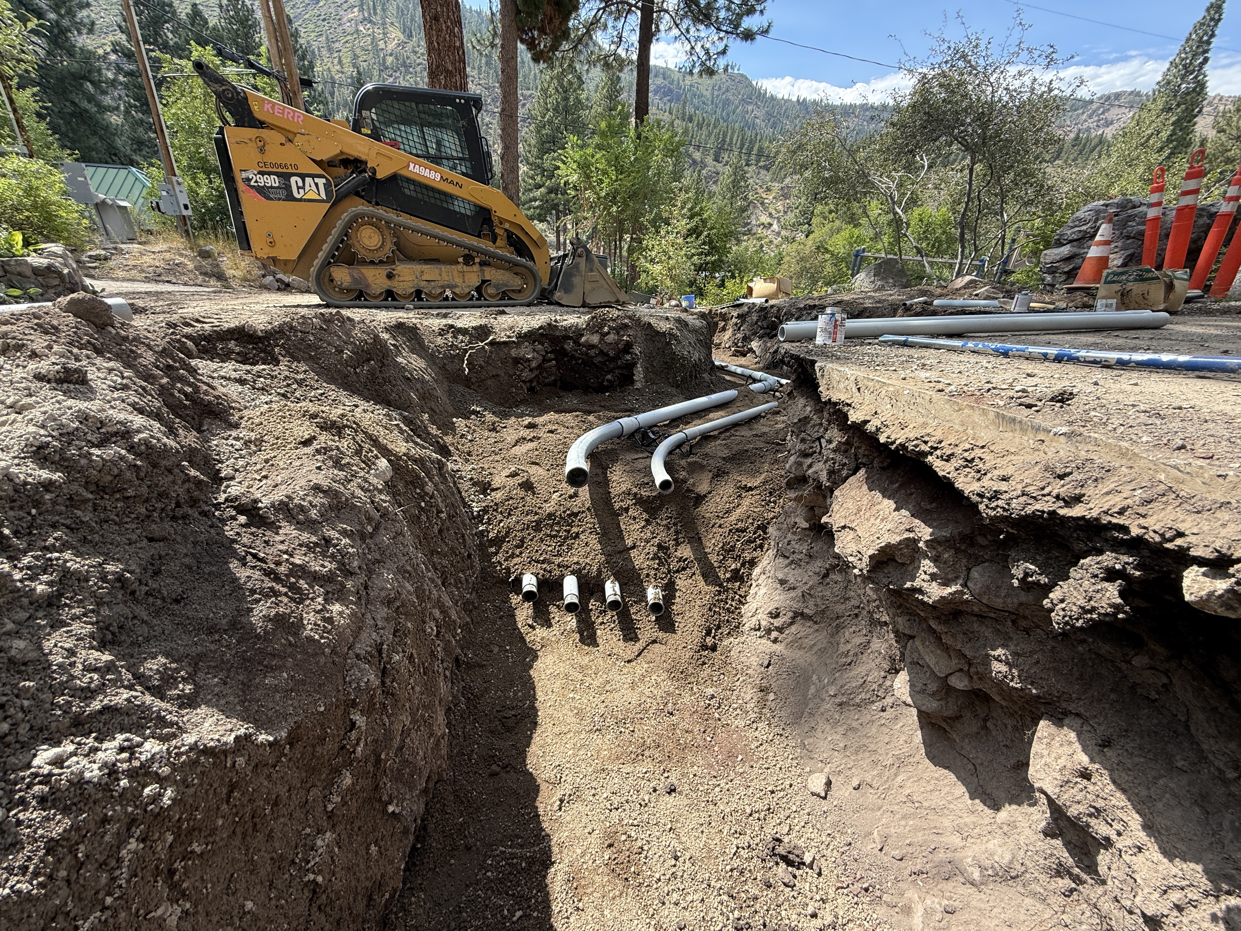 The image shows an open trench with several PVC pipes partially installed at the bottom. A skid steer loader is parked near the trench, suggesting ongoing excavation work. Traffic cones are set up near the work area, likely for safety. Soil is piled around the trench, and a clear blue sky suggests fair weather conditions.