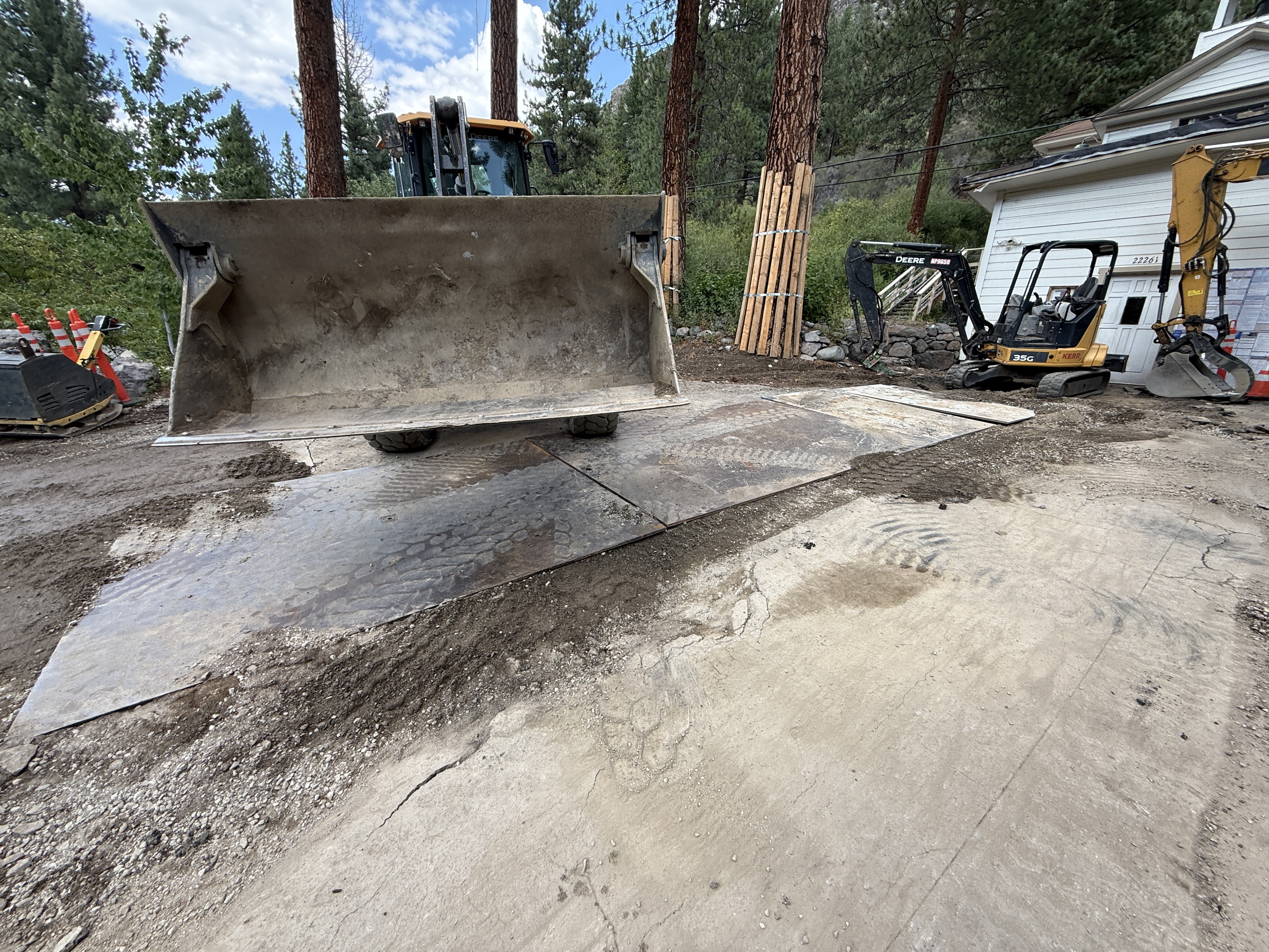 The image shows a front loader with its bucket raised, engaged in activity on a construction site. Metal plates are laid on the ground, likely to stabilize the surface for equipment movement. A mini excavator is positioned nearby, alongside construction materials and tools. The site is surrounded by trees, and part of a building is visible in the background.