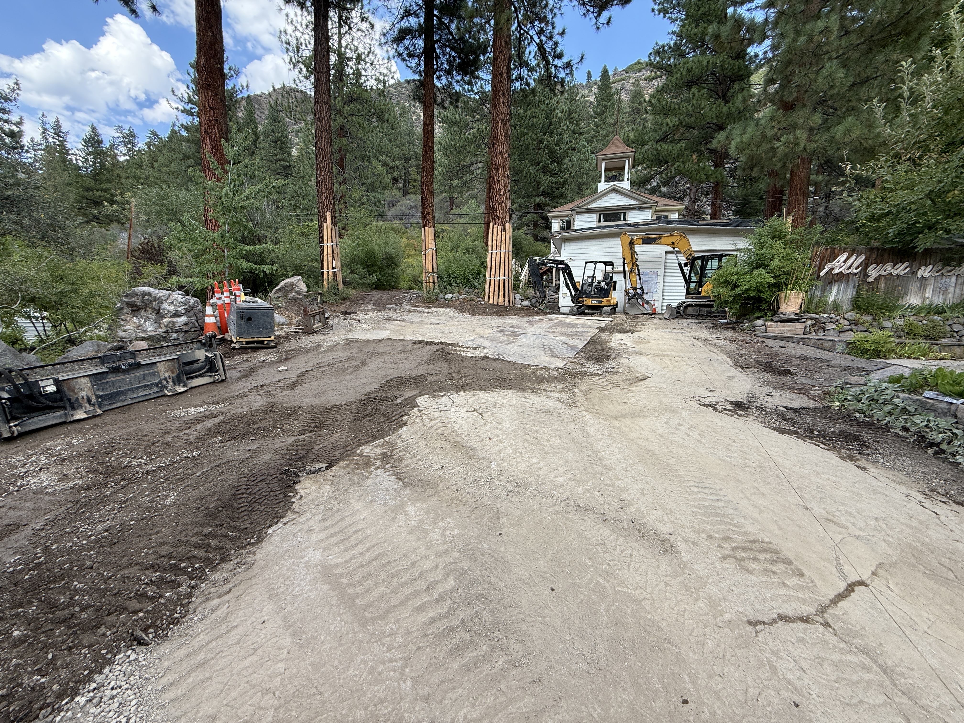 The image shows an area undergoing site grading with exposed soil and some gravel. Two pieces of heavy machinery, likely excavators, are parked near a small building in the background. Construction materials and traffic cones are staged off to the side. The surroundings include trees and a fence that features some text.