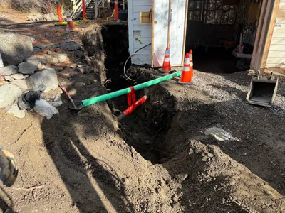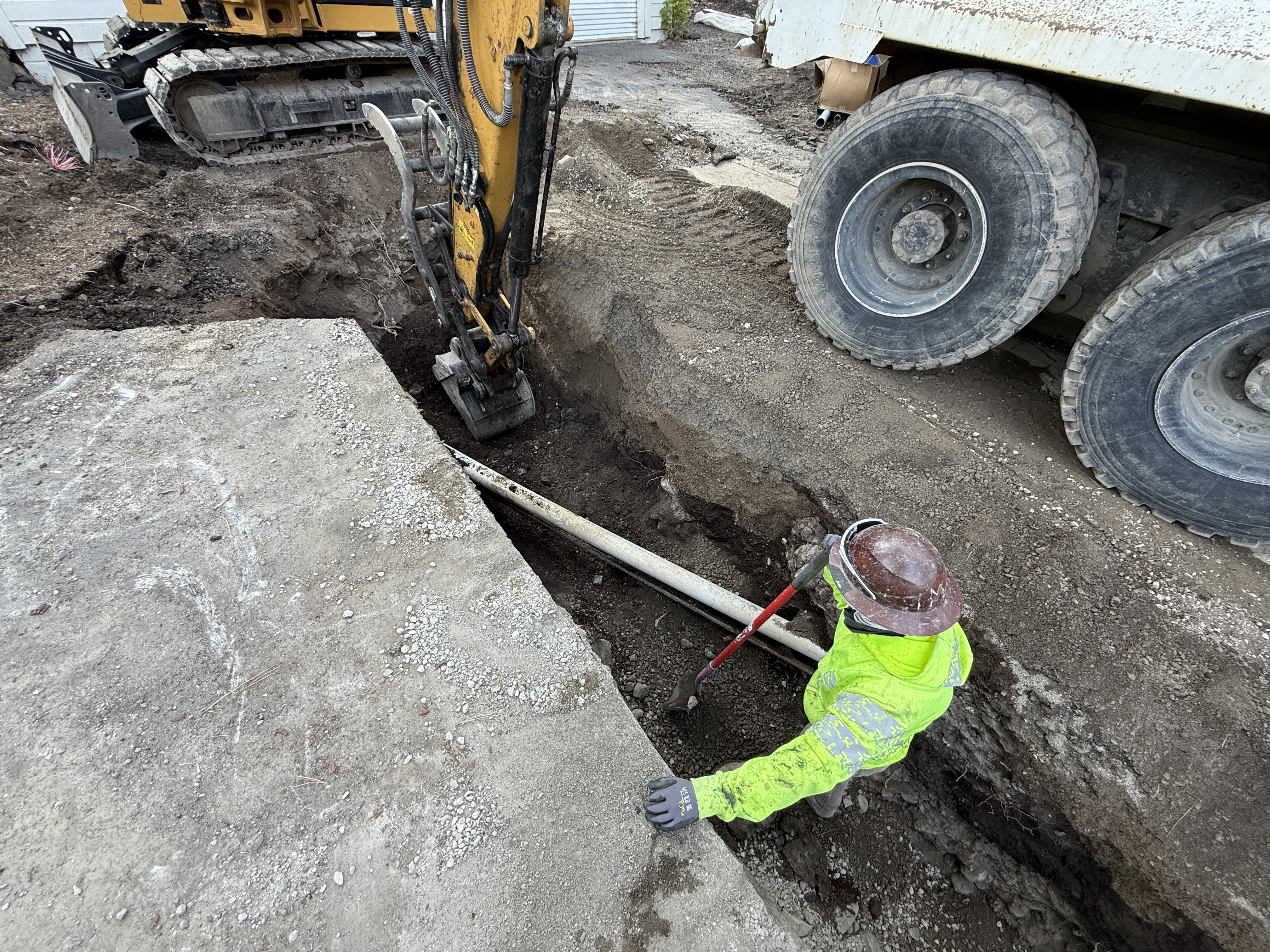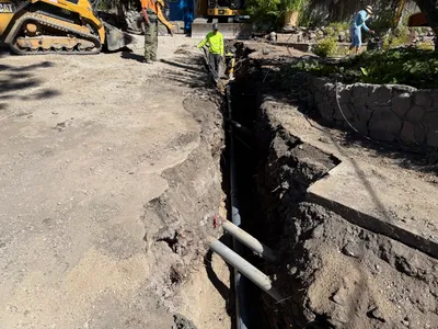 The image shows a worker in a trench which is being excavated by a piece of heavy machinery. The worker is holding a tool and is wearing safety gear. The trench is relatively narrow and contains a pipe, possibly for utilities. Adjacent to the trench is heavy machinery, such as an excavator and a truck. It appears to be a construction zone focused on trenching activities.