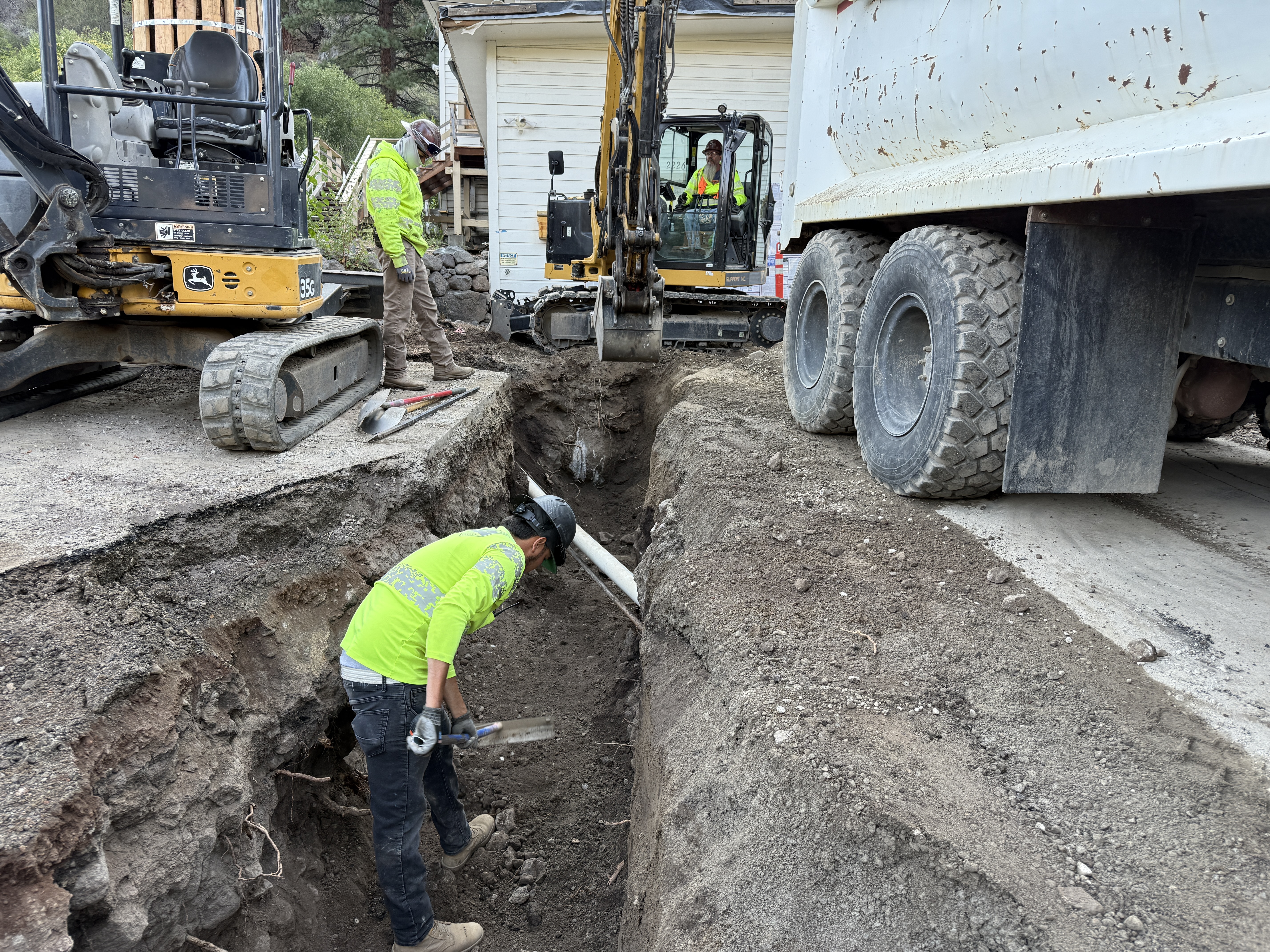 The image shows workers involved in trenching activity near a building. Pipes are laid in an open trench where one worker is using a hand tool. Two excavators are positioned parallel to the trench, with one worker operating one of them. A dump truck is parked nearby, partially on the trench edge, indicating active excavation or material transport.