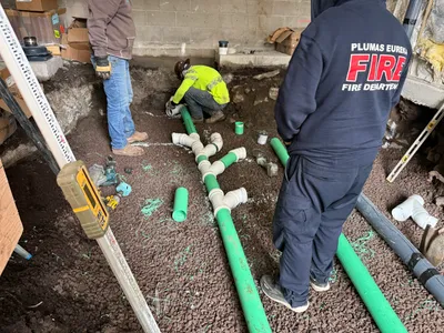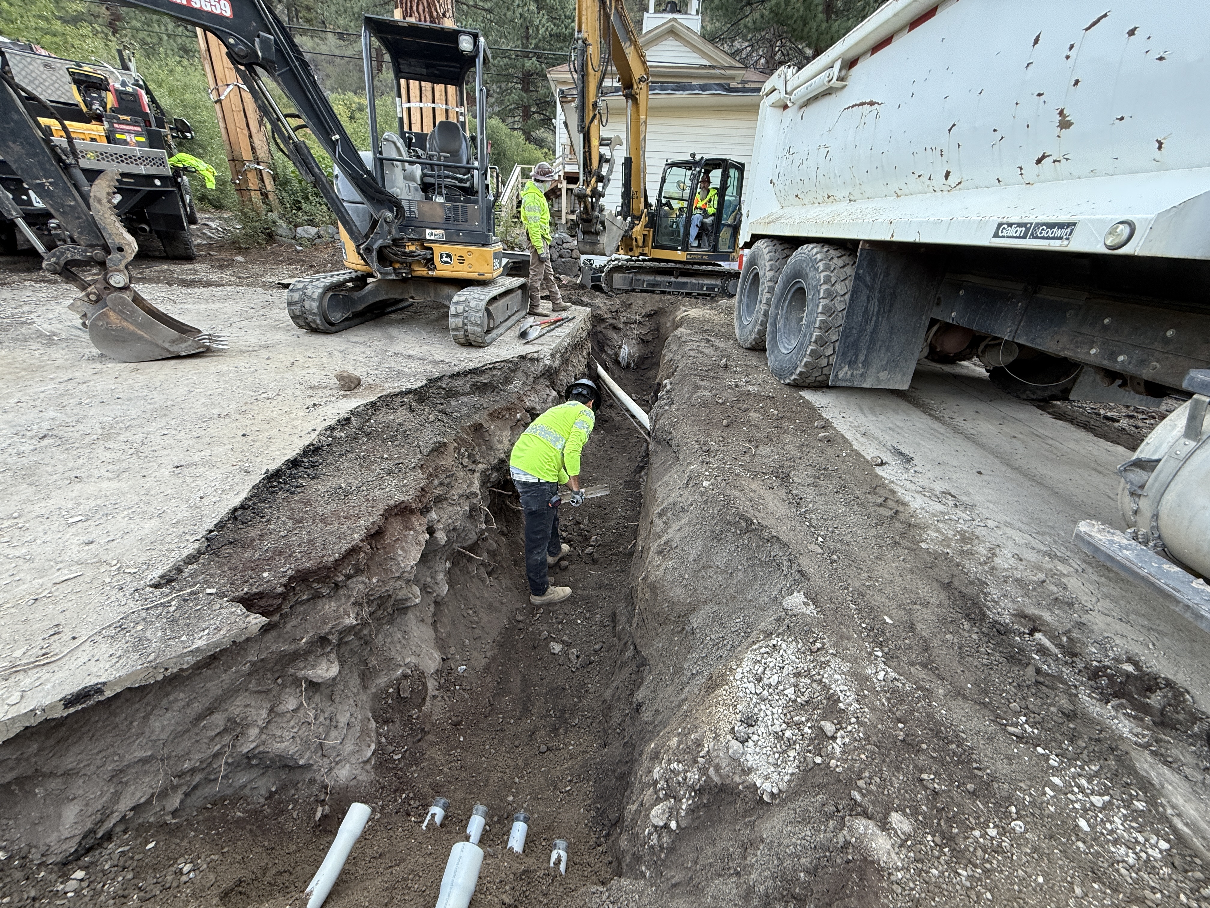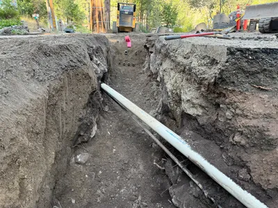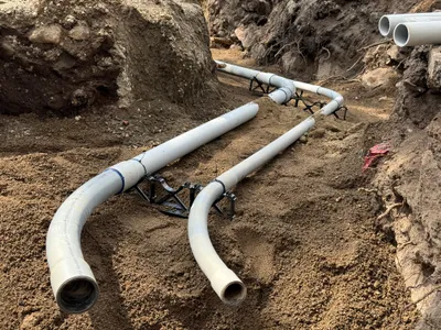 The image shows workers engaged in trenching activities with two excavators positioned near an open trench. A worker inside the trench appears to be maneuvering or installing a linear component. Multiple duct pipes are visible at the bottom of the trench, suggesting installation work. The area surrounding the trench is a mix of soil and rubble, indicating recent excavation.