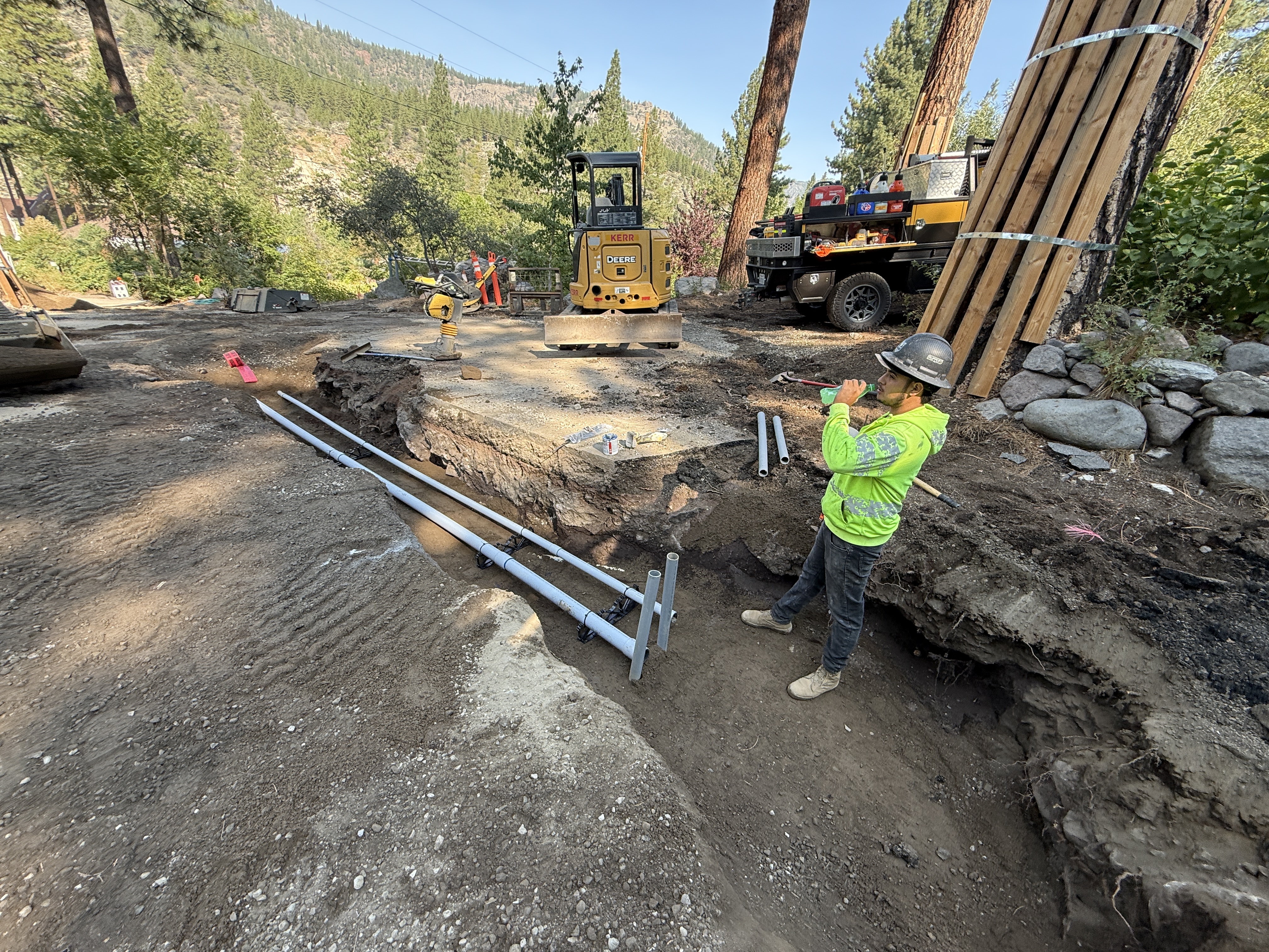 The image shows an active trenching scene with a worker in a hard hat and high-visibility gear observing or inspecting near an open trench. Pipes are laid within the trench, and a compactor is positioned on the trench edge. A piece of heavy machinery and a truck are present in the background, along with stacked materials. The environment is a wooded area with a dirt surface.