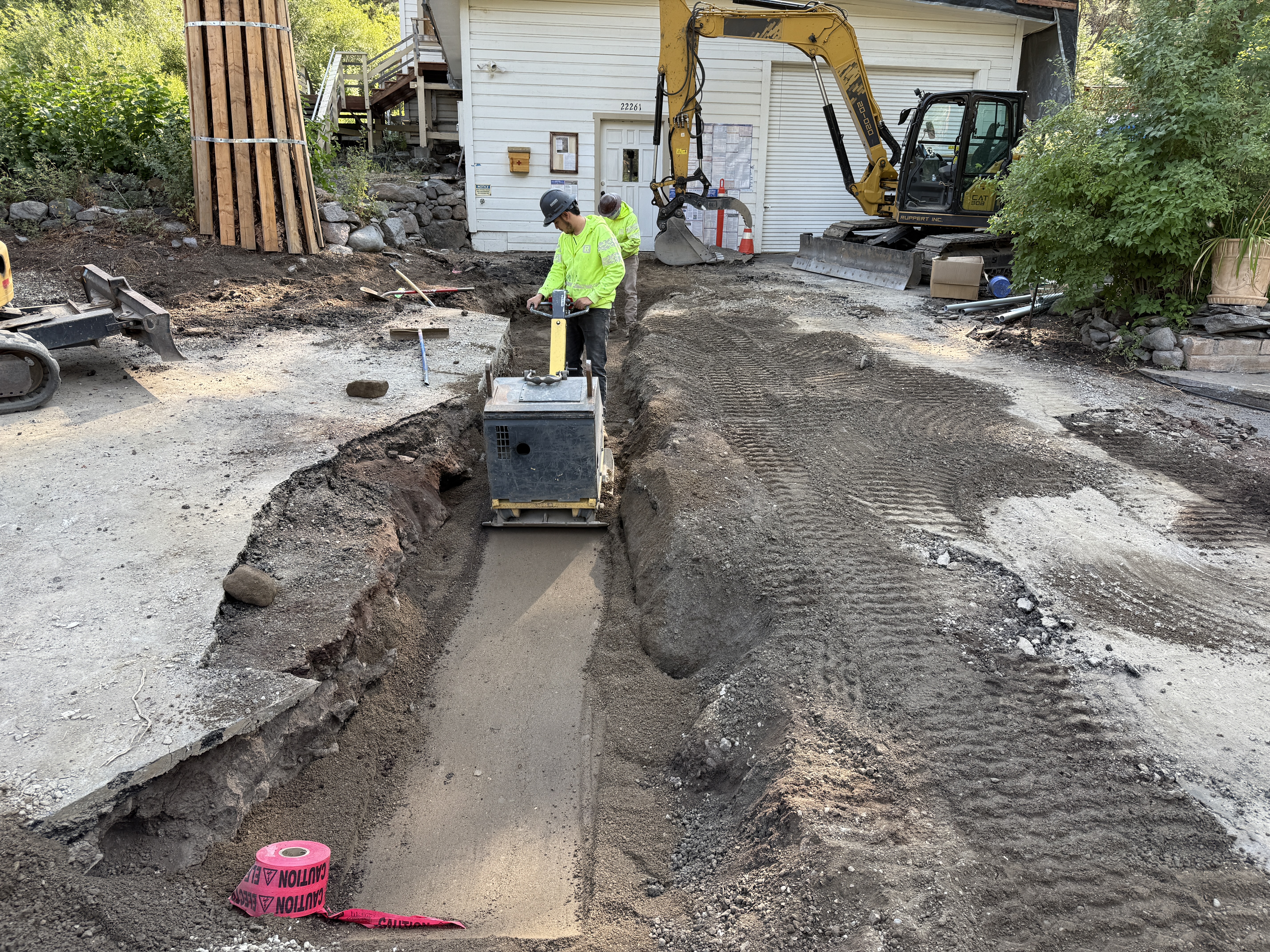 An operator is using a vibratory compactor in an open trench running parallel to a building. A backhoe is visible in the background near the building. There is caution tape near the trench and soil piles along the sides. Some wooden structures and vegetation are visible on the left and right sides of the image.