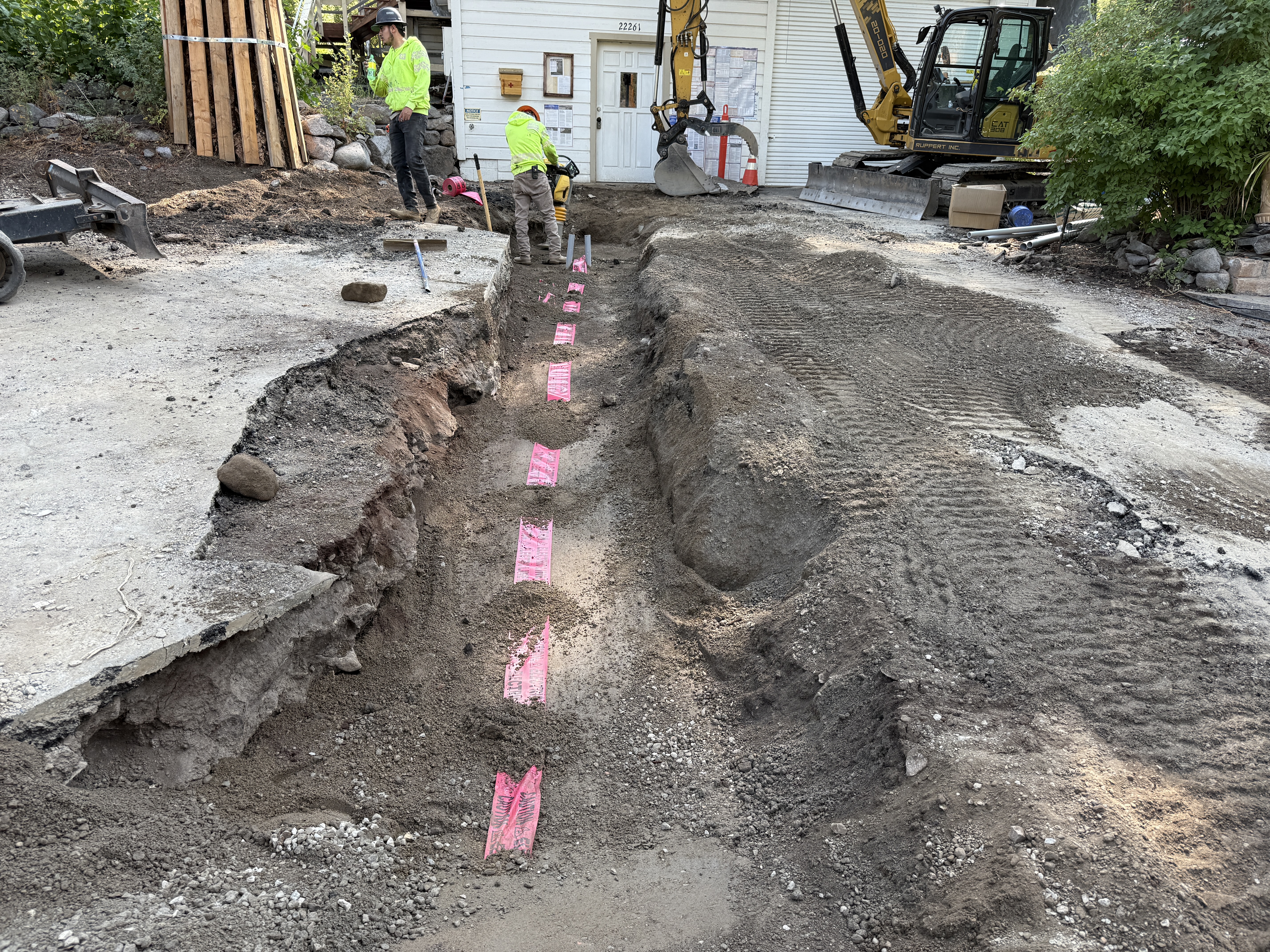 The image shows trenching activity near a white building where workers are present around an open trench. An excavator is positioned at the far end of the trench, which is lined with pink caution tape. The trench runs alongside a driveway or pavement with some loose soil and worked ground. Workers are wearing appropriate safety gear, and the area is partially excavated.