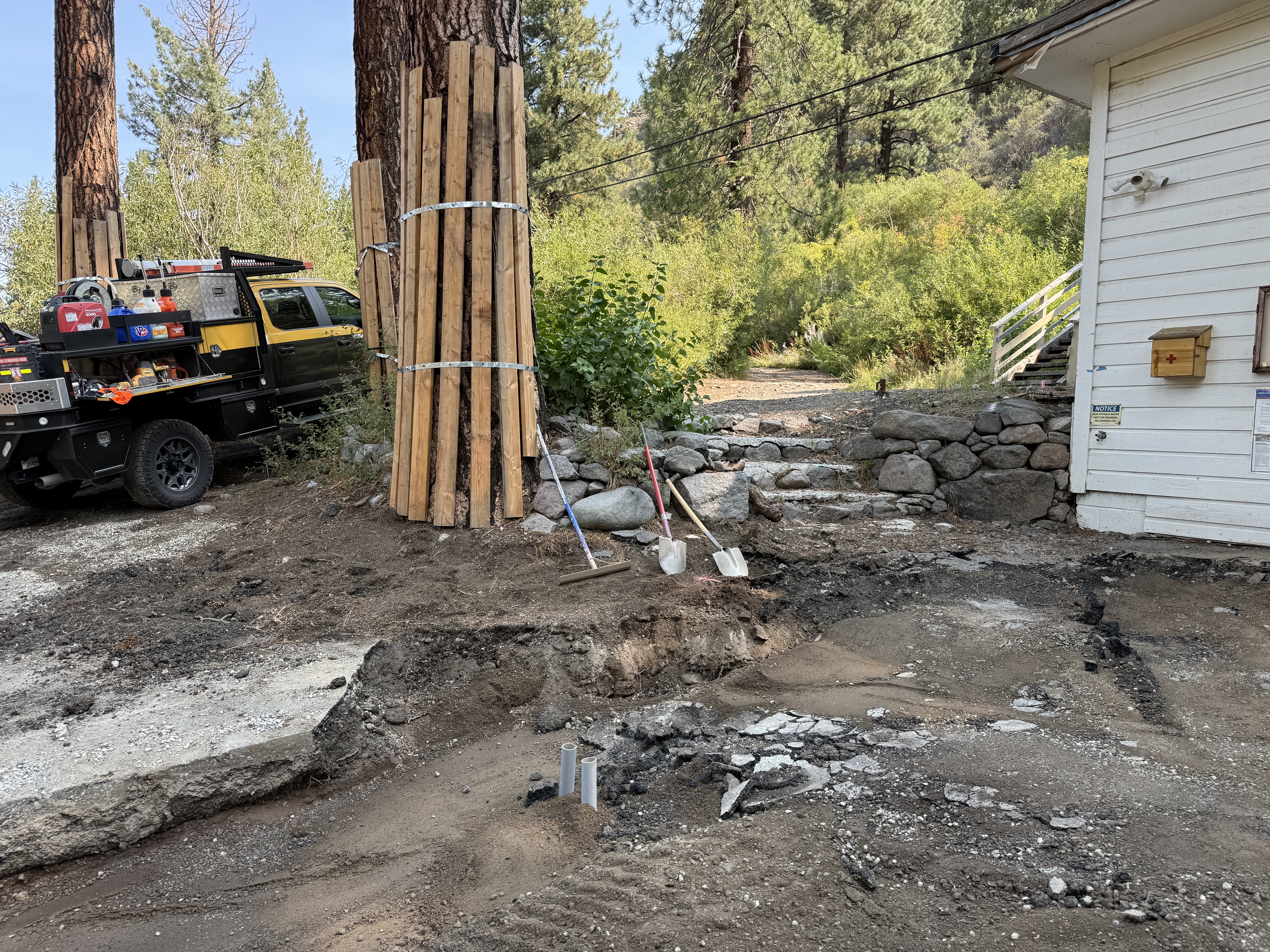 The image shows an excavation area next to a white building with shovels and a rake at the site. There is visible concrete debris on the ground, indicating recent excavation work. Wood slats are strapped around two trees. A work truck with construction equipment is parked nearby.