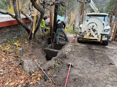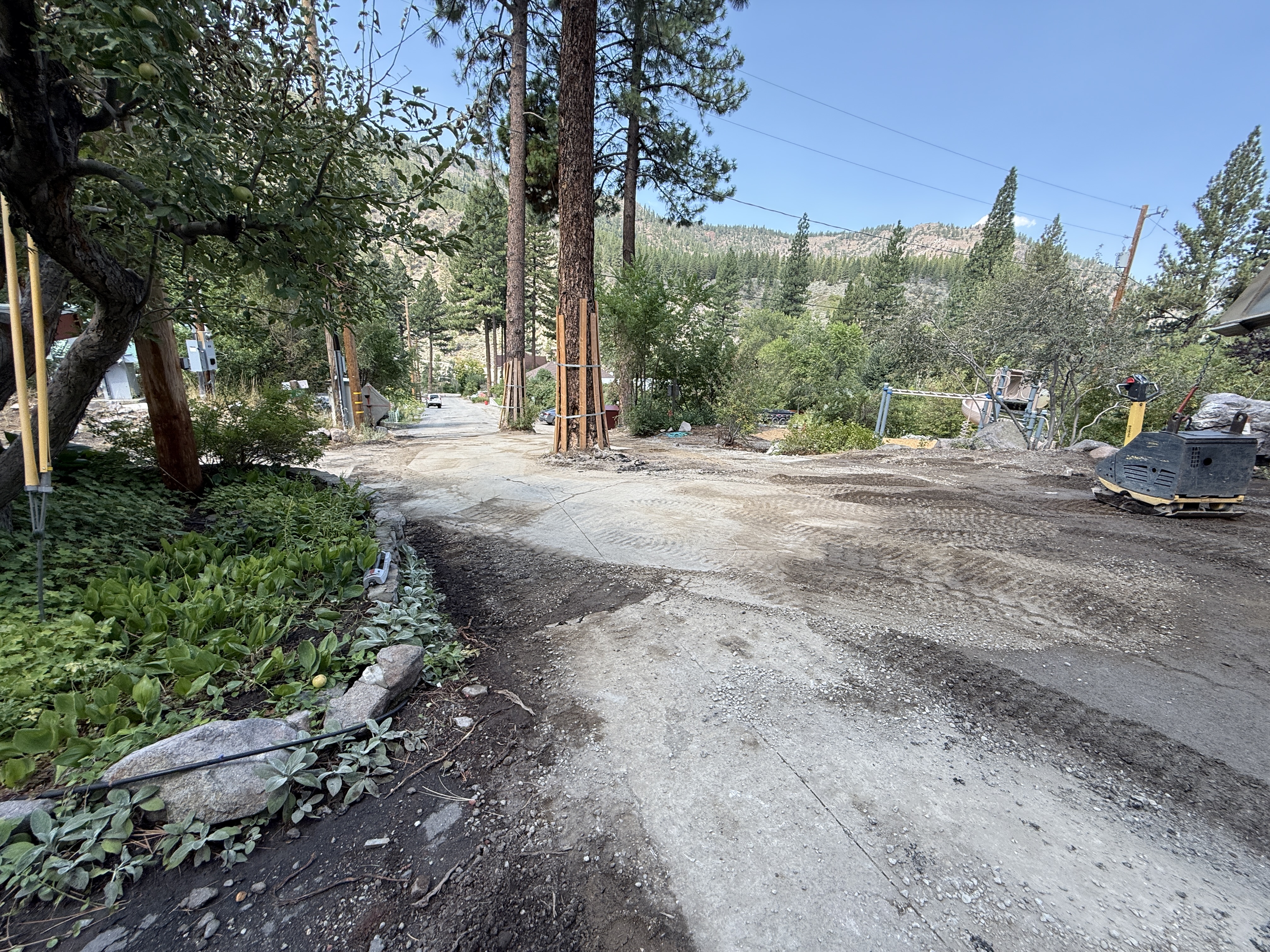 The image shows a cleared dirt pathway through a treed area. Soil compaction marks are visible on the ground, indicating site grading activities. A compacting machine is staged on the right side of the path, with surrounding natural vegetation. Wooden stakes supporting young trees are present, likely for protection during construction.