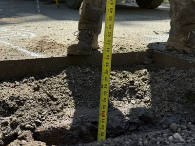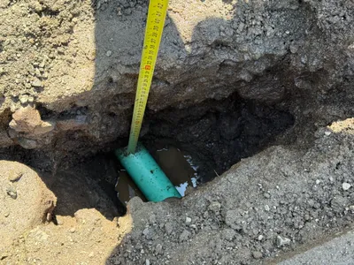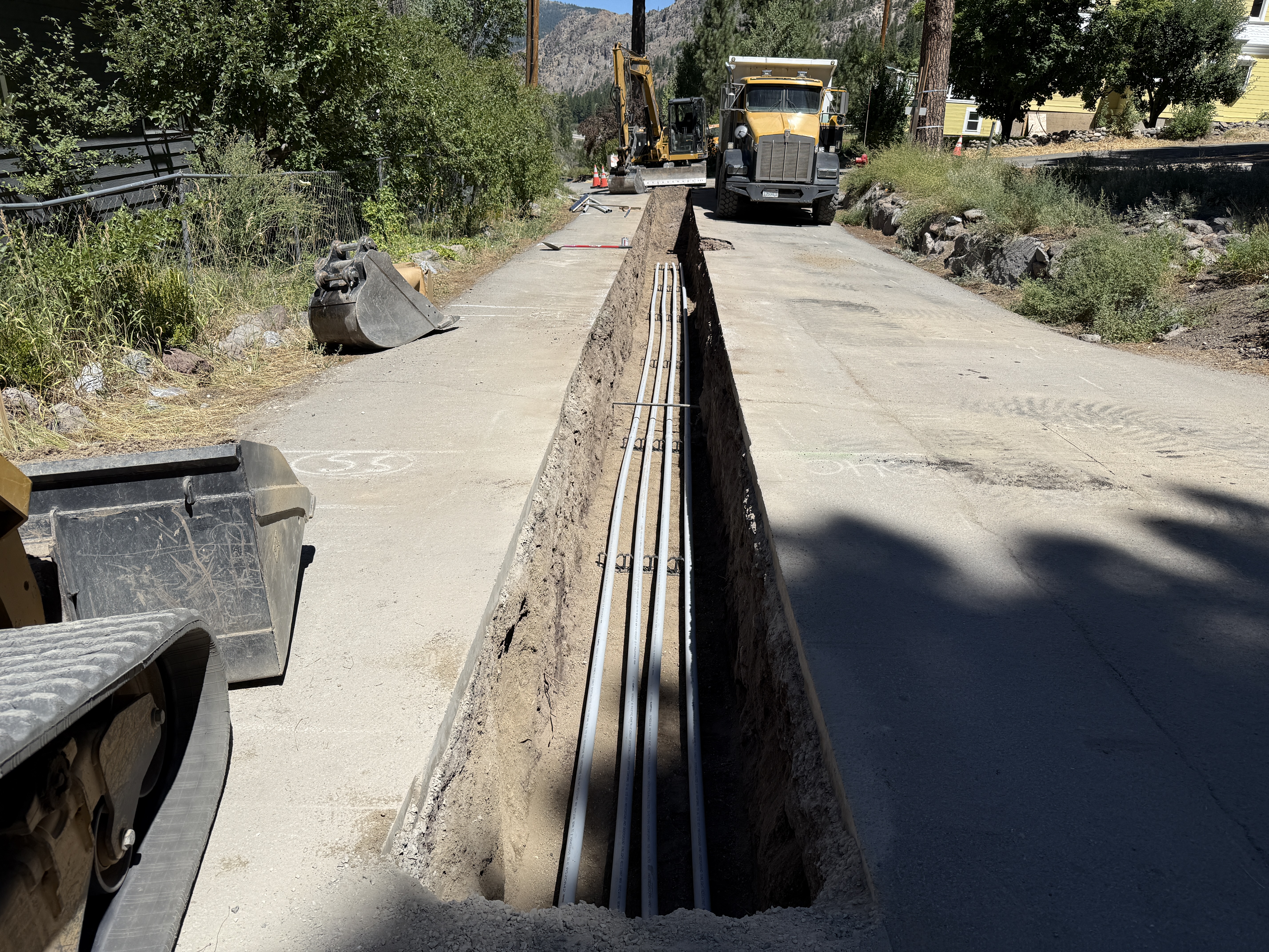 The image shows a straight trench running along a paved roadway with several conduits already laid in the trench. Visible heavy machinery includes an excavator with a track and a truck in the background. The trench is unguarded and open, exposing the conduits. Vegetation lines the road where disturbance is occurring.