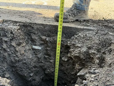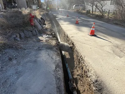 A trench runs along the right side of a roadway, indicating active trenching work. Several pipes are visible within the trench, suggesting ongoing or recent pipeline installation. Heavy equipment is present on the left, likely used for excavation or trenching. The surrounding area includes a house, trees, and a grassy embankment. It is a sunny day with clear visibility.