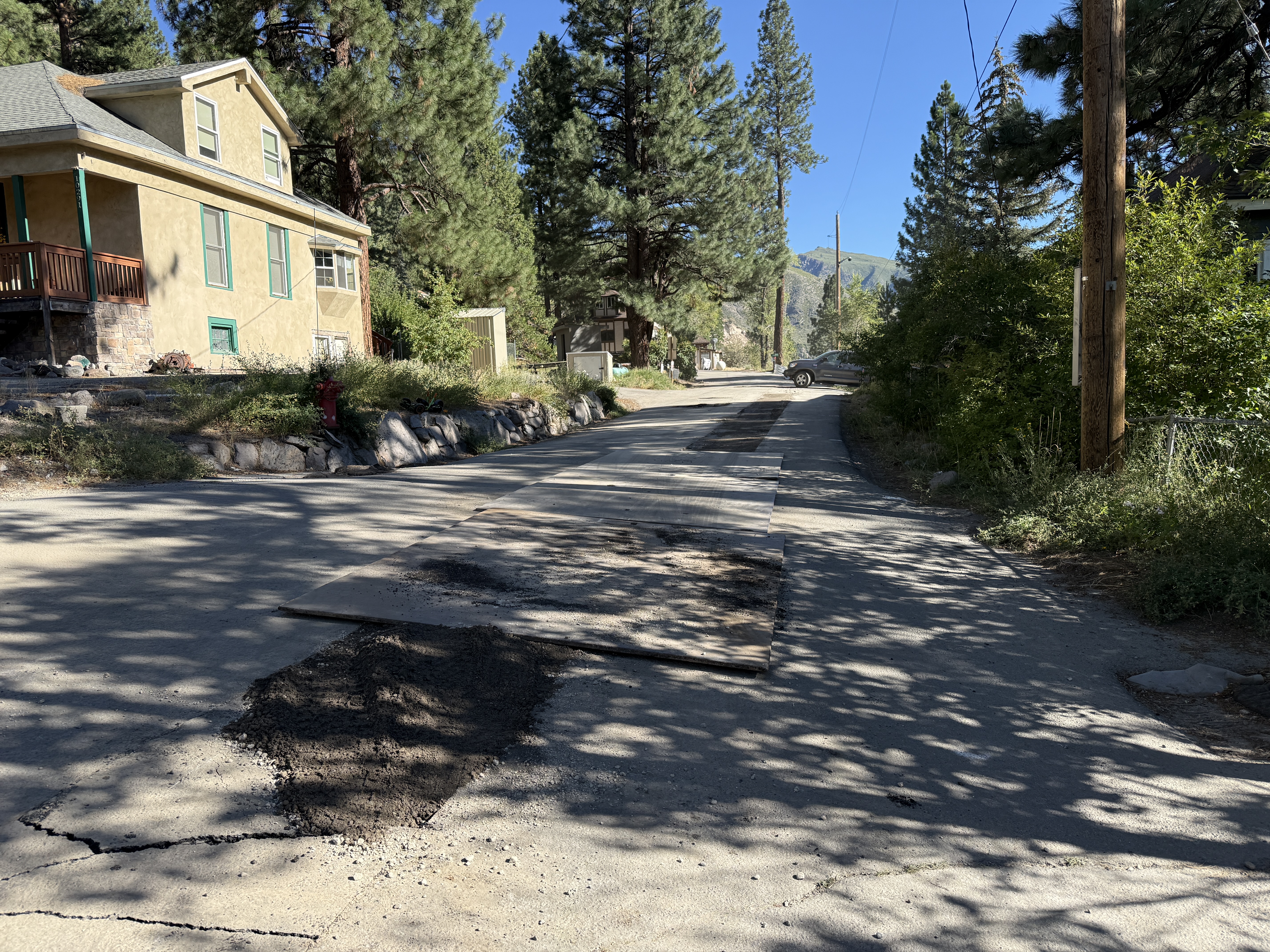 The image shows a street undergoing paving surface restoration with several patches of asphalt present. The patches are spread across the road, which suggests recent repair work. There are residential homes and trees lining the sides of the street, indicating the suburban setting. The lighting is natural, and the weather appears clear.