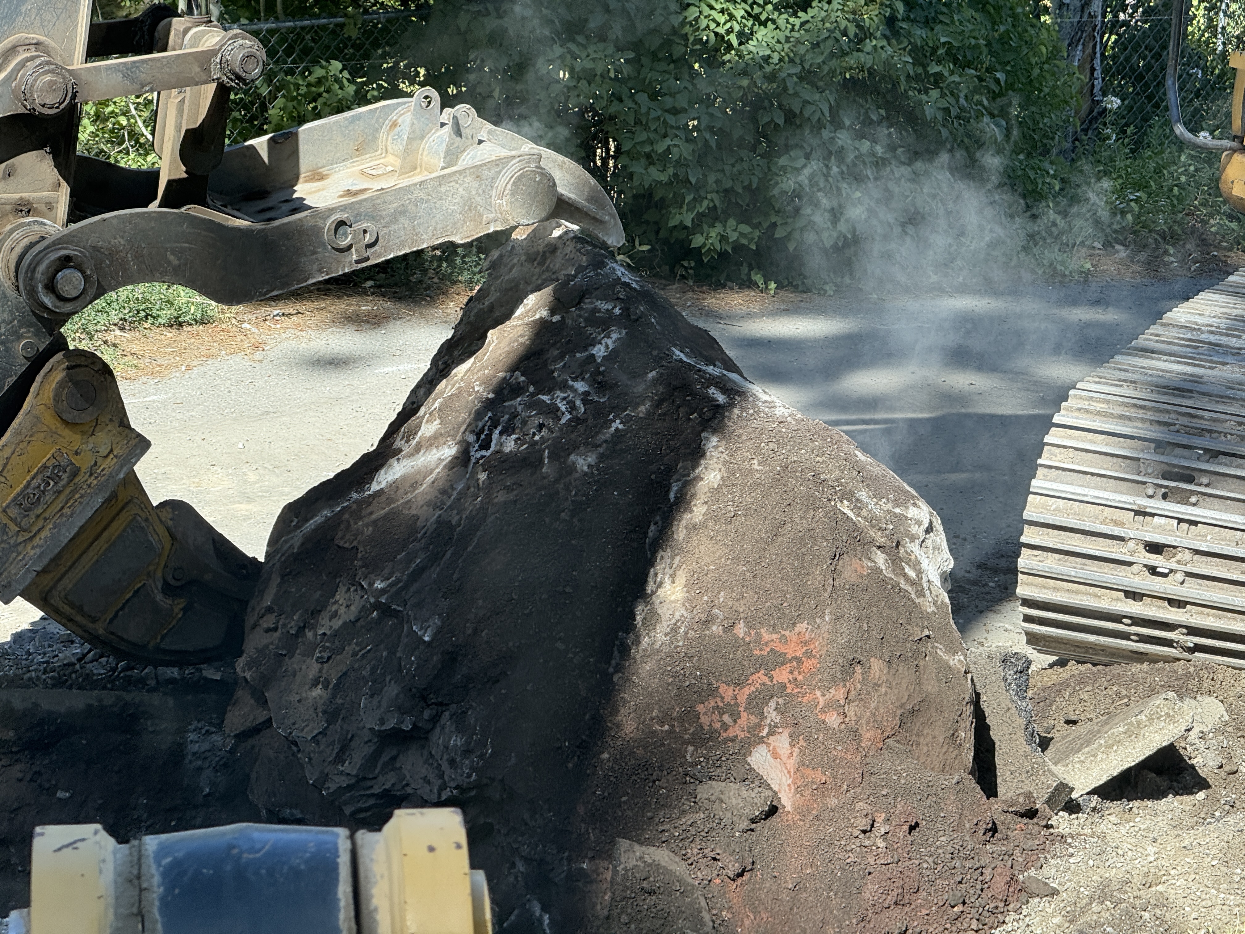 The image shows a large machinery's attachment lifting or manipulating a large boulder on a paved area. The boulder appears to be in the process of being excavated or relocated. Steam or dust is visible around the rock, indicating recent activity. No personnel or additional safety equipment are visibly marked in the frame.
