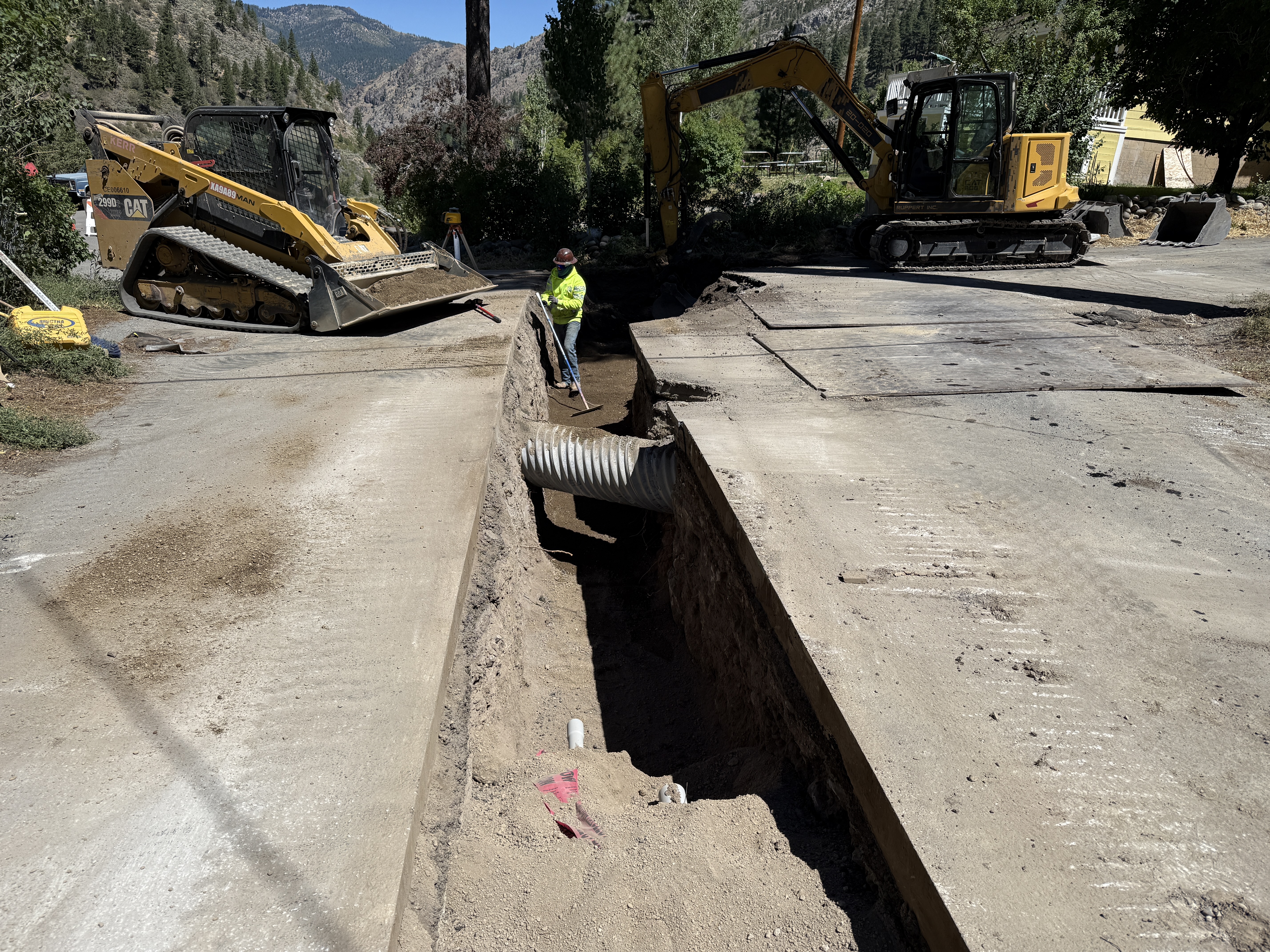 A trench is open in the center of a paved area with a pipe visible inside it. There are two pieces of heavy machinery on site: an excavator on the right side of the trench and a skid steer loader on the left. A worker is present, wearing a hard hat and hi-vis vest, inspecting or working near the trench. Road plates are positioned near the trench possibly for covering or stabilization.