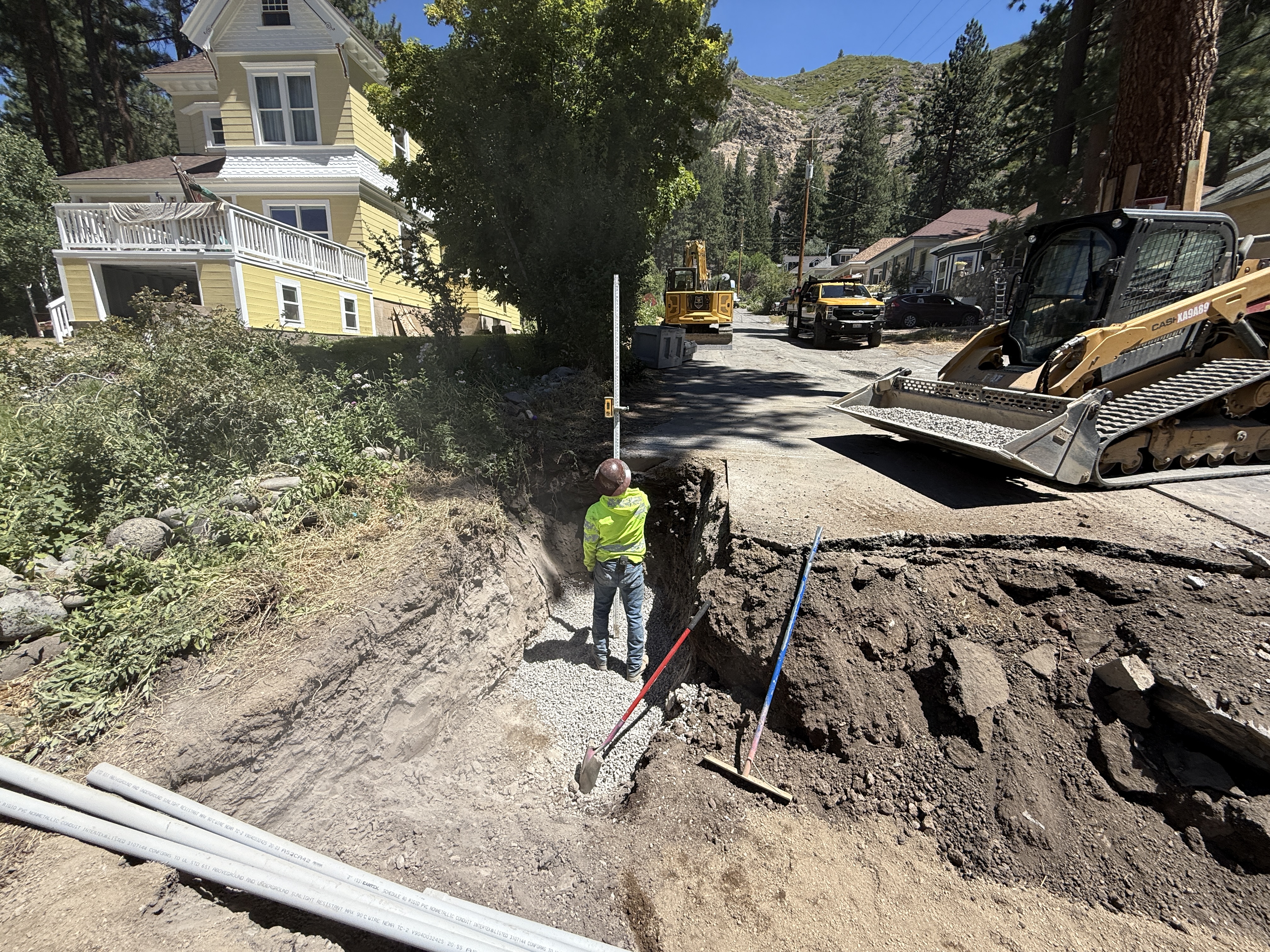 A worker is standing in a trench next to a residential house, indicating ongoing trenching work. A track loader is present on the road, carrying gravel, and there are lengths of conduit or pipes laid beside the trench. The worker is wearing high-visibility PPE. The setting appears to be a suburban location with equipment and materials staged nearby.