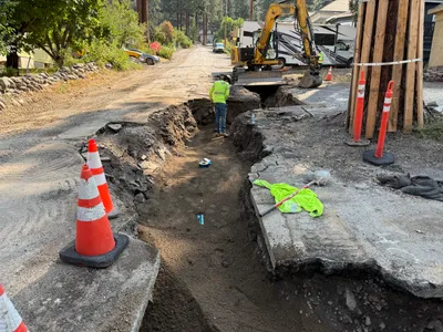 trench with dirt and gravel clear weather with daylight equipment on road access
