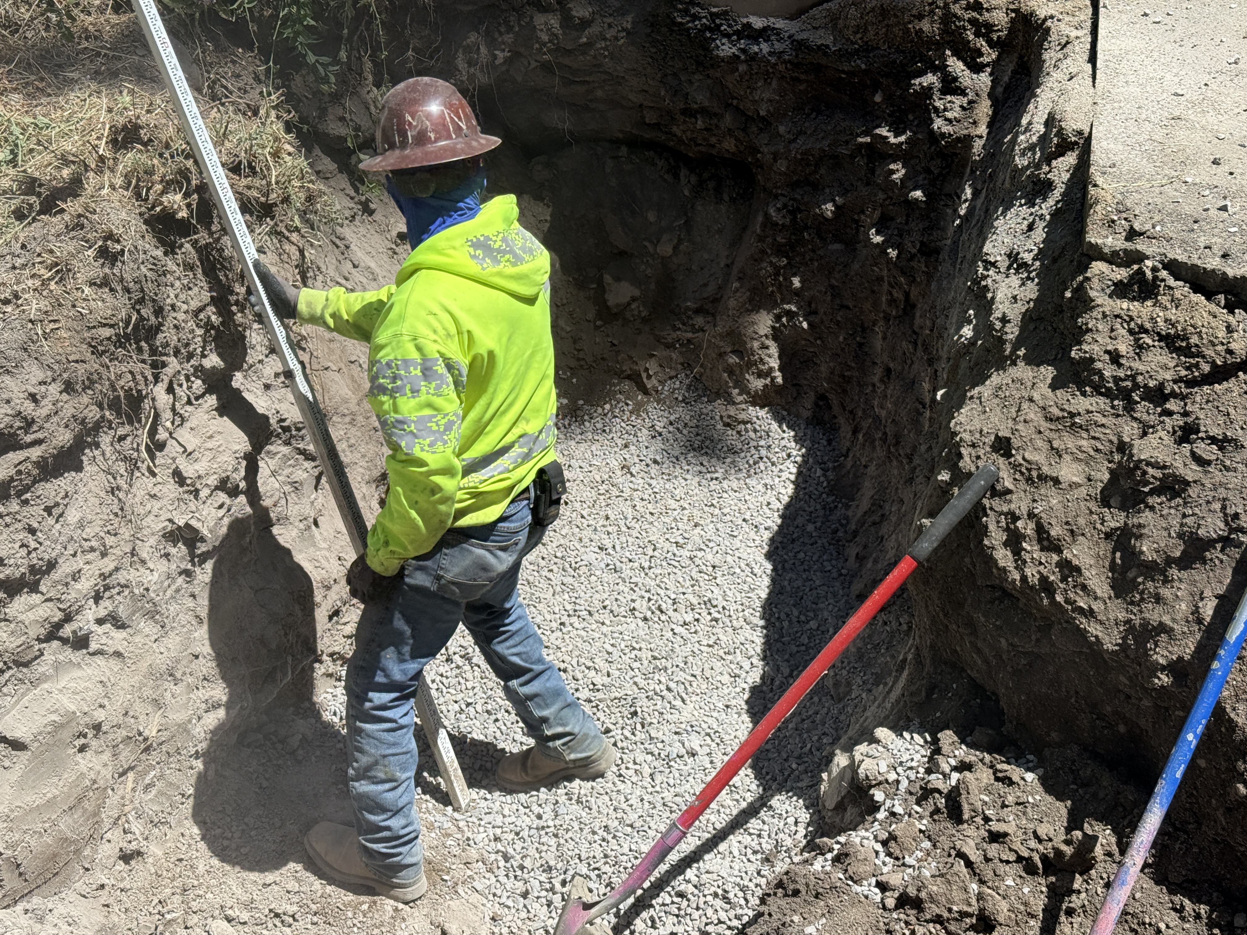 A worker wearing a hard hat, hi-vis jacket, and work boots is standing in a trench holding a leveling rod. The trench is compacted with gravel, and there are tools such as shovels visible. The lighting suggests a sunny day enhancing site visibility.