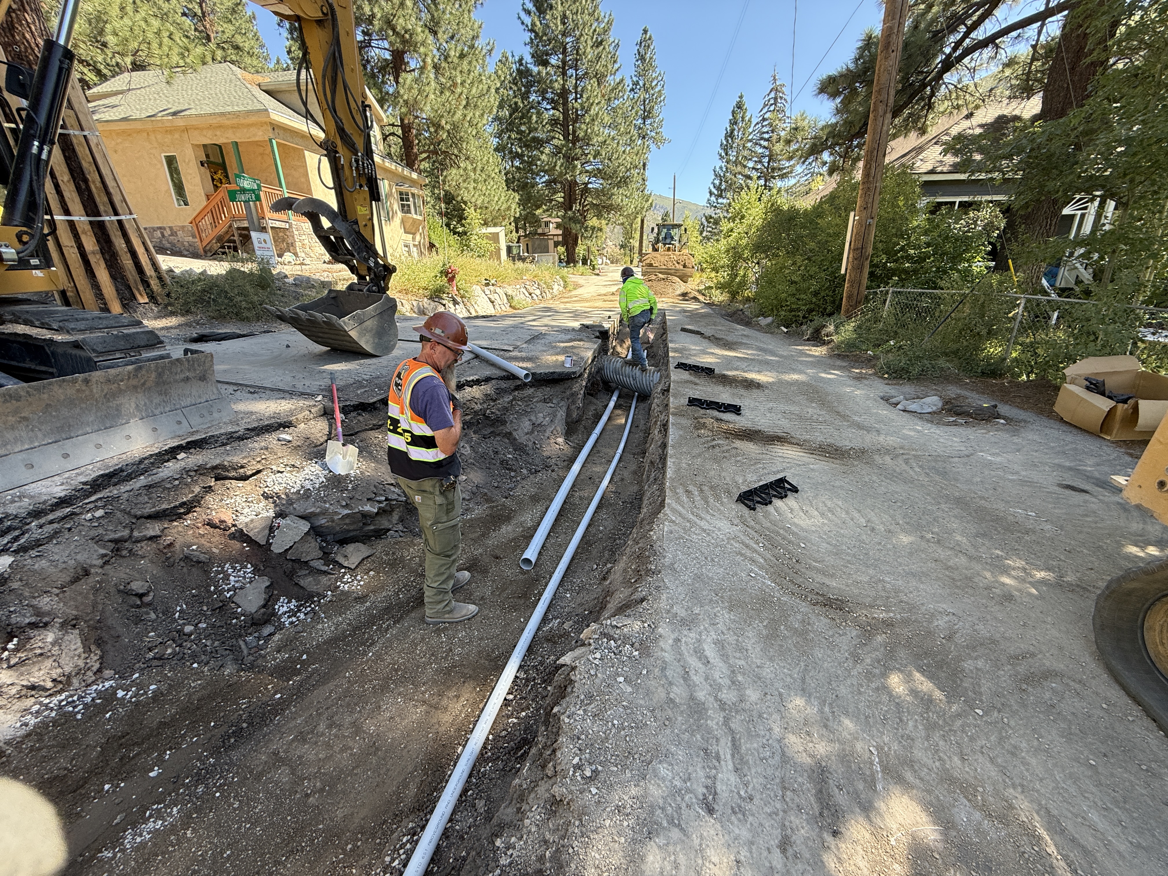 The image shows two workers engaged in duct bank installation within an open trench. One worker is handling a conduit, and the trench is lined with PVC pipes. An excavator is positioned with its bucket near the trench edge. Safety equipment such as hard hats and high-visibility vests are worn by the workers. The area is surrounded by residential buildings and trees.