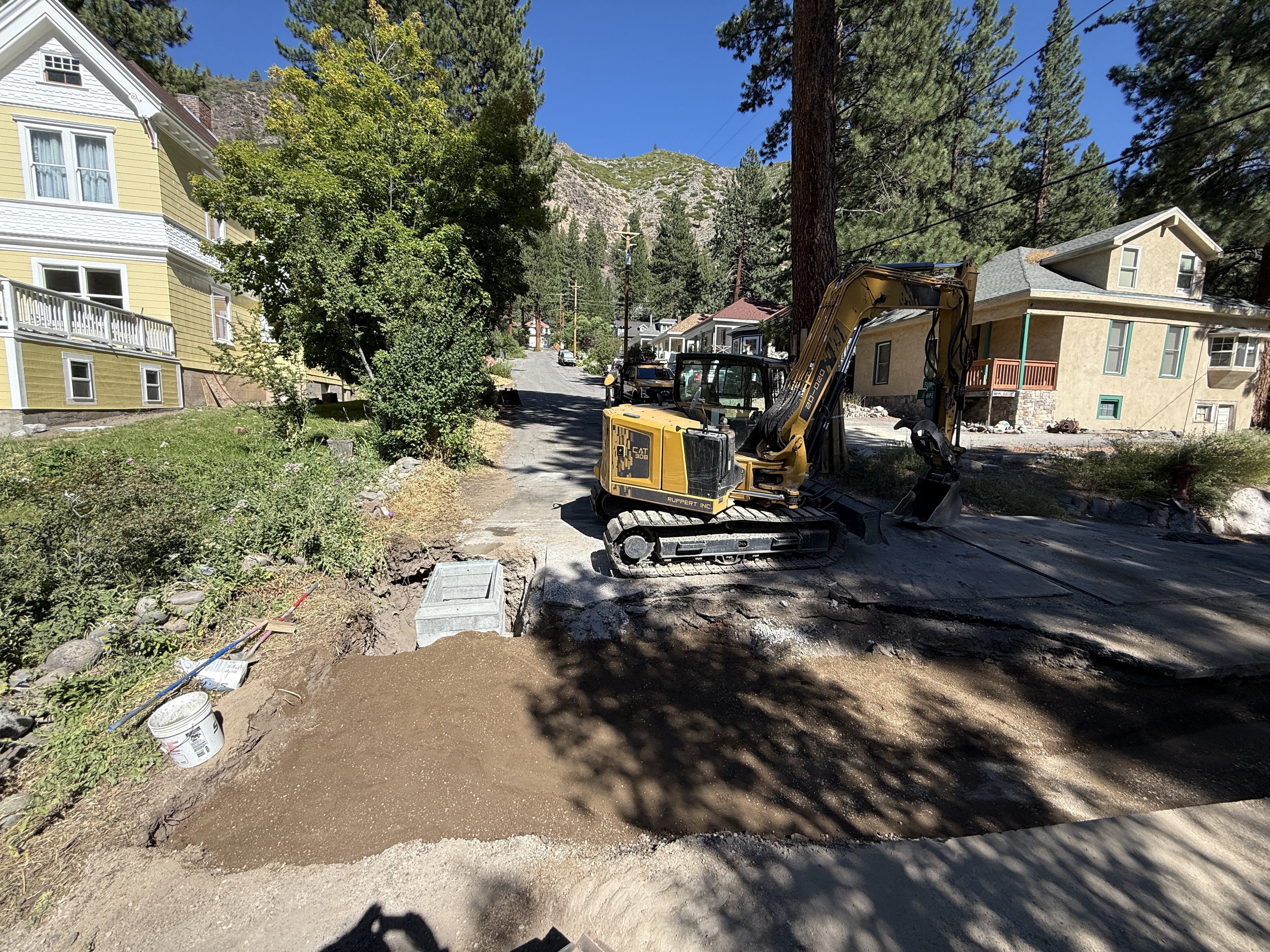The image shows an excavator positioned on a residential street performing excavation work, with a visible trench and soil piles surrounding the area. There are two residential buildings on either side of the street. The surrounding area is clear, suggesting ongoing work preparation or installation. A stack of concrete blocks and some hand tools are present near the trench.