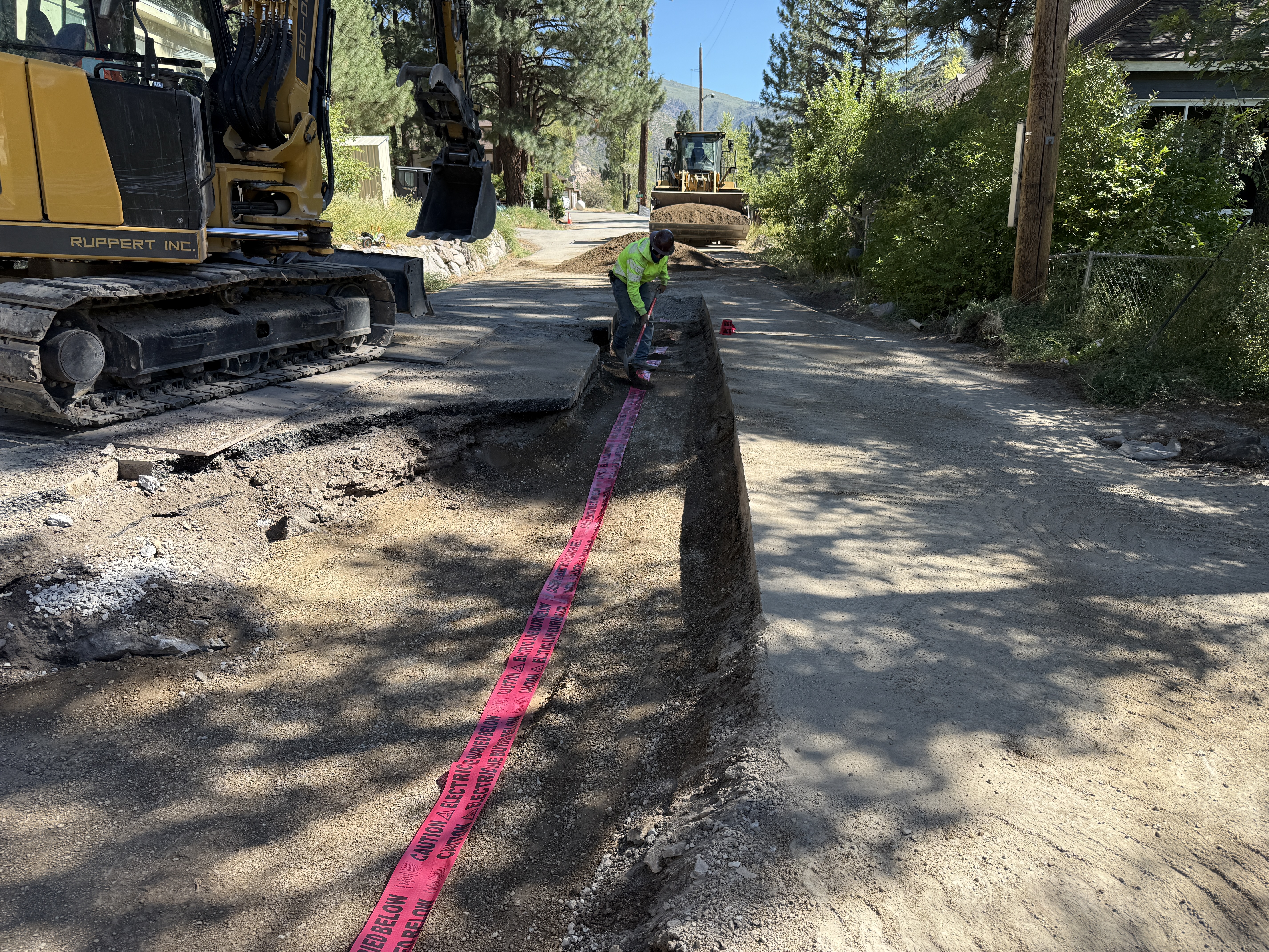 The image shows an open trench with a construction worker placing caution tape along its length. A large excavator is positioned to the left of the trench, and a loader is visible further back. The trench runs along the length of a dirt road, surrounded by trees and residential structures.