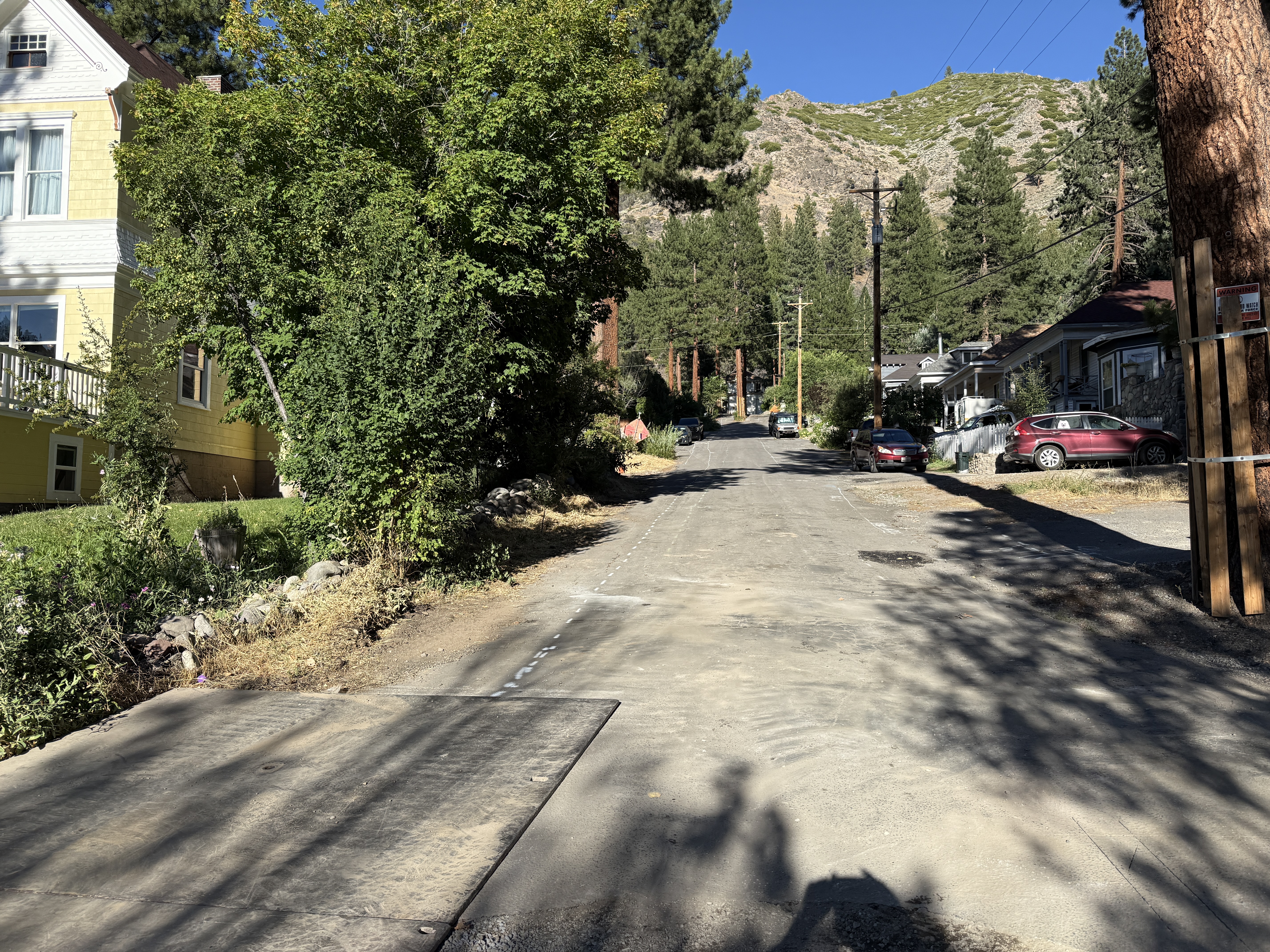 The image captures a quiet residential street lined with trees and houses. The road appears unpaved or dirt, possibly under maintenance or unfinished. Two vehicles are parked on the right side of the road, and there is a visible incline leading up to a hilly area in the background.