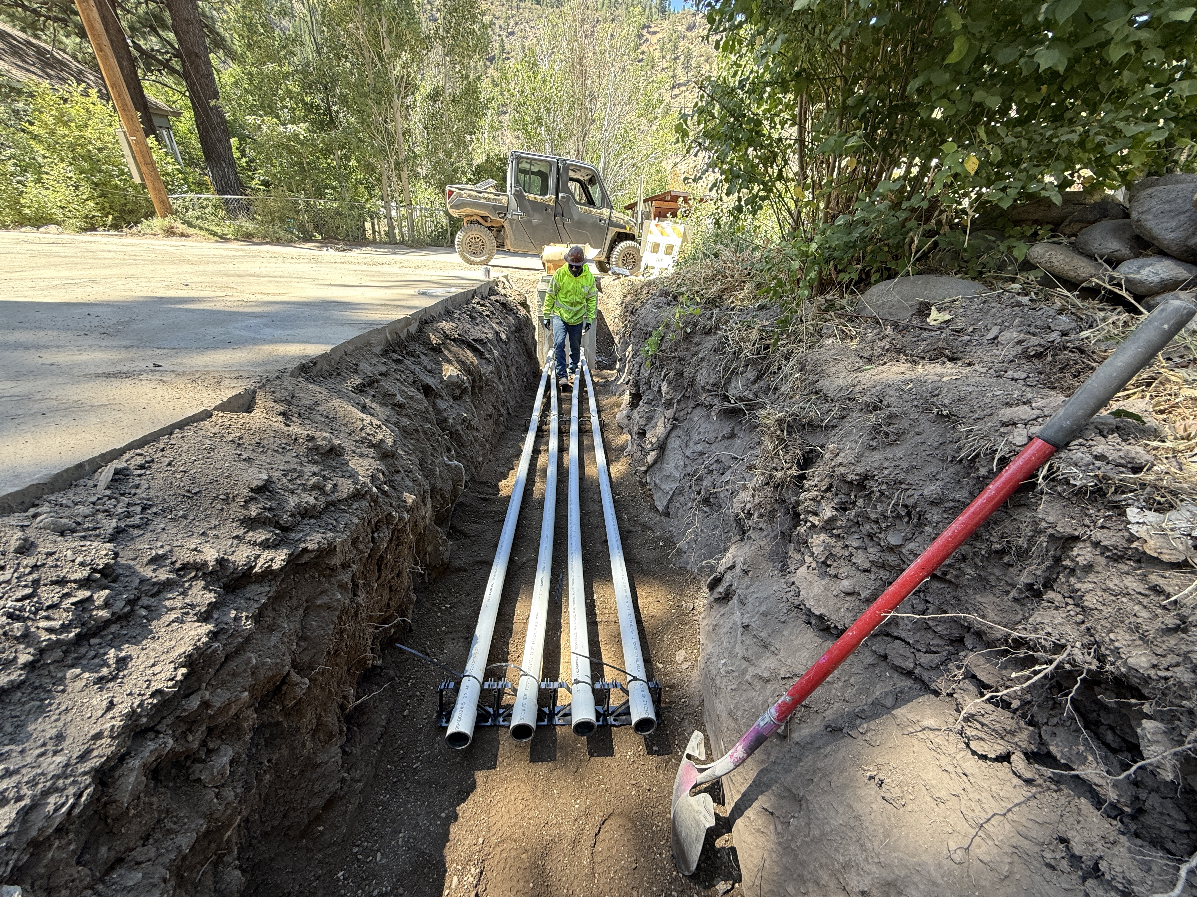 The image shows workers placing multiple conduit pipes in a trench alongside a dirt road. A utility vehicle is parked nearby, and a shovel is visible, indicating manual labor activity. Workers are wearing safety gear such as hard hats and hi-vis vests.