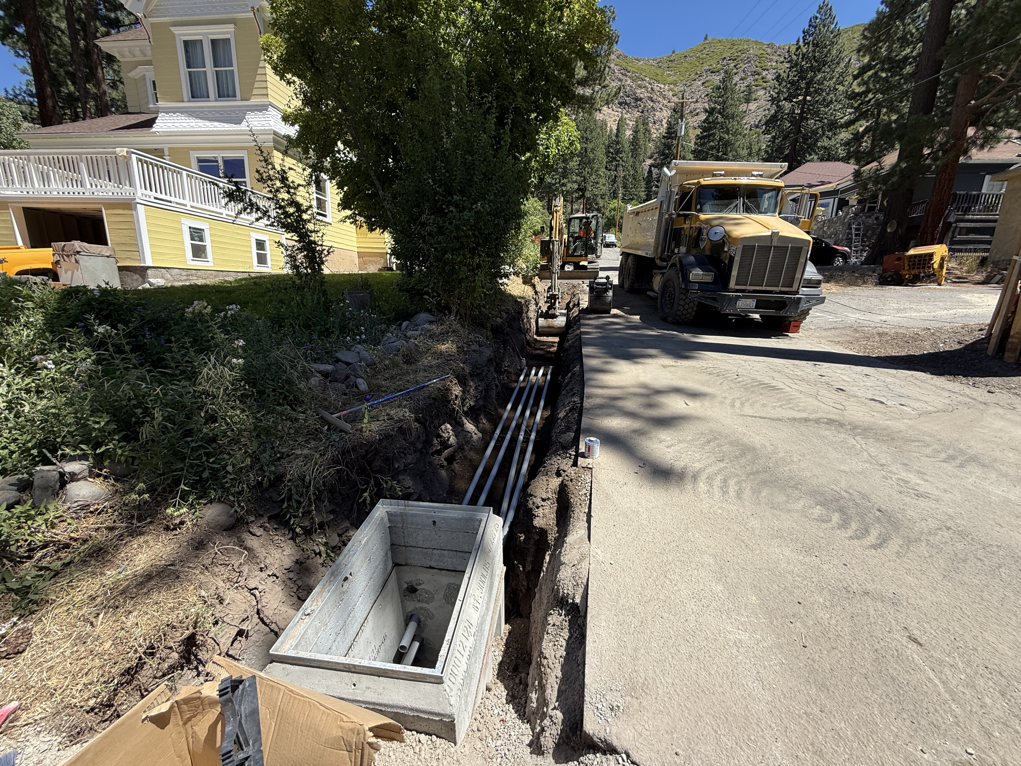 The image shows a trench along the side of a residential street, adjacent to a yellow house. Conduit lines are laid inside the trench, and a rectangular trench box is visible. A large dump truck is parked on the street, and an excavator is positioned near the trench. The site appears to be in a mountainous area with clear weather, and some construction materials are visible near the trench.