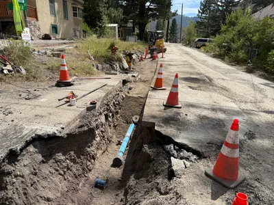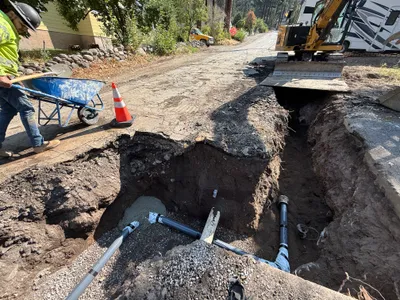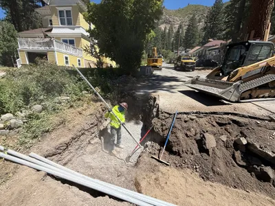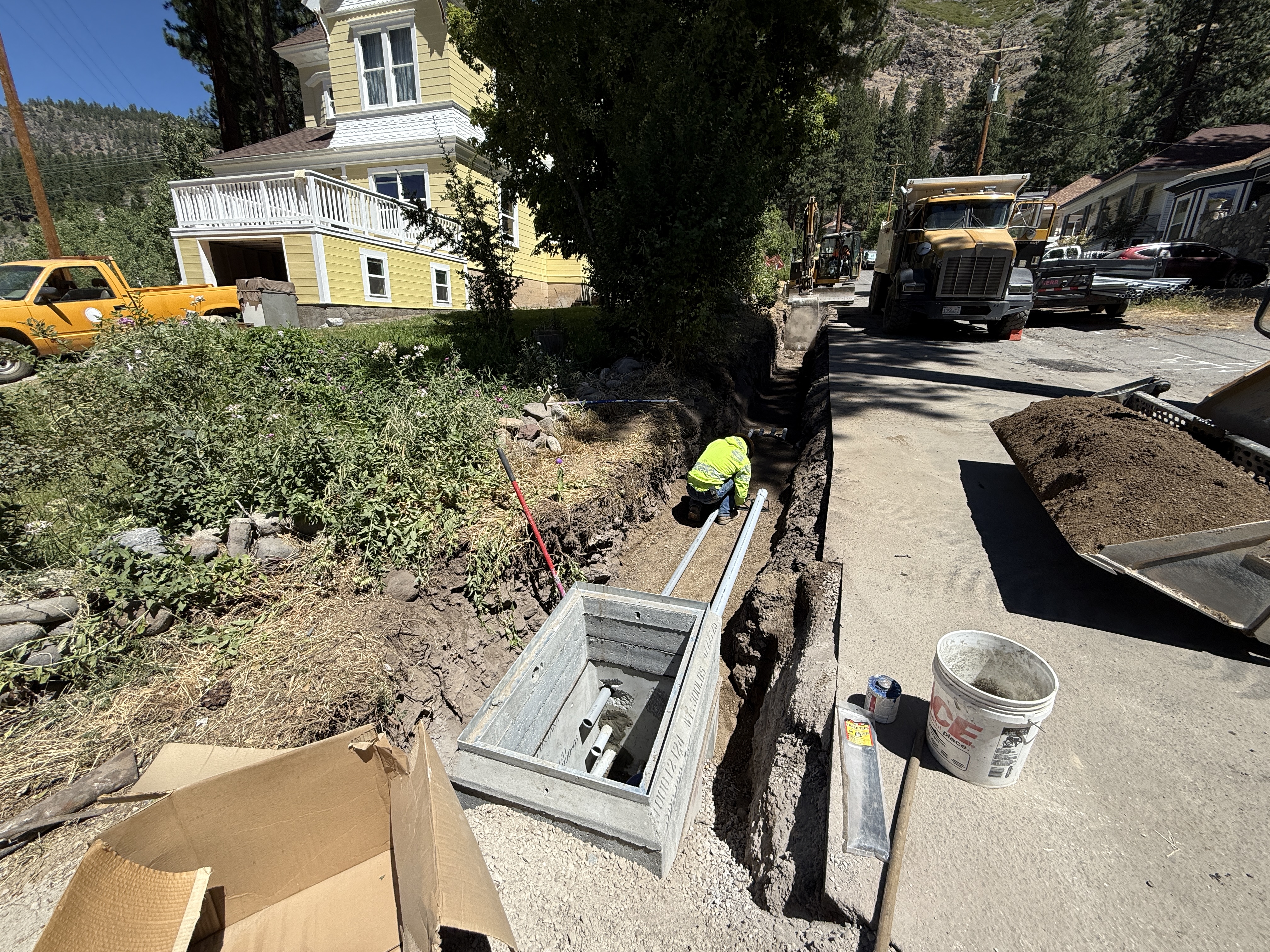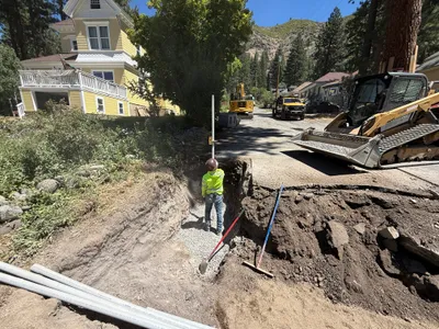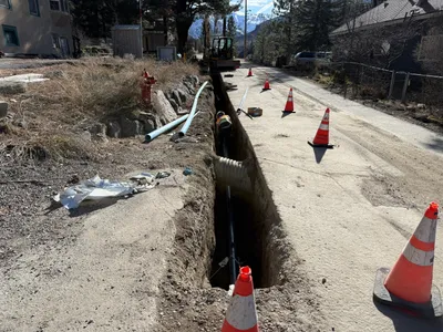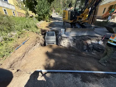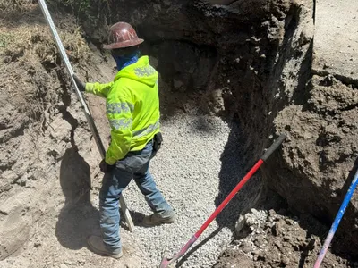 A trench is being dug alongside a road, with a worker seen installing conduit pipes into a concrete vault. The scene takes place in a residential area, with heavy machinery such as trucks present in the background. The ground along the trench is dug up, suggesting ongoing excavation work. The worker is wearing PPE including a hi-vis vest.