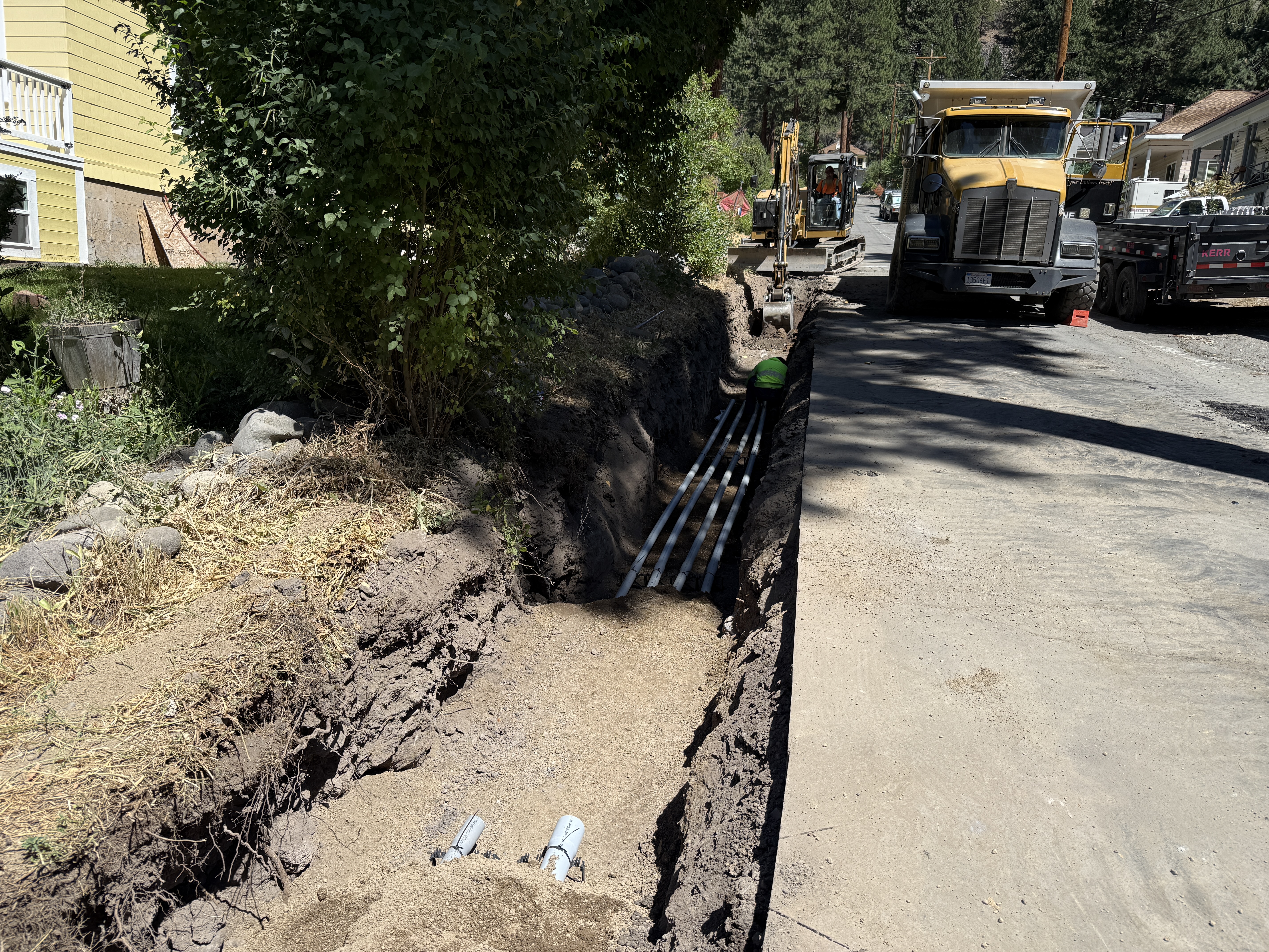 The image shows a trench running alongside a roadway, where multiple conduit pipes are being laid out. A worker is visible near the conduits, and there is an excavator actively digging the trench. A large dump truck is parked near the work area, and the site is surrounded by trees and a nearby house. The trench appears deep and has been recently excavated.