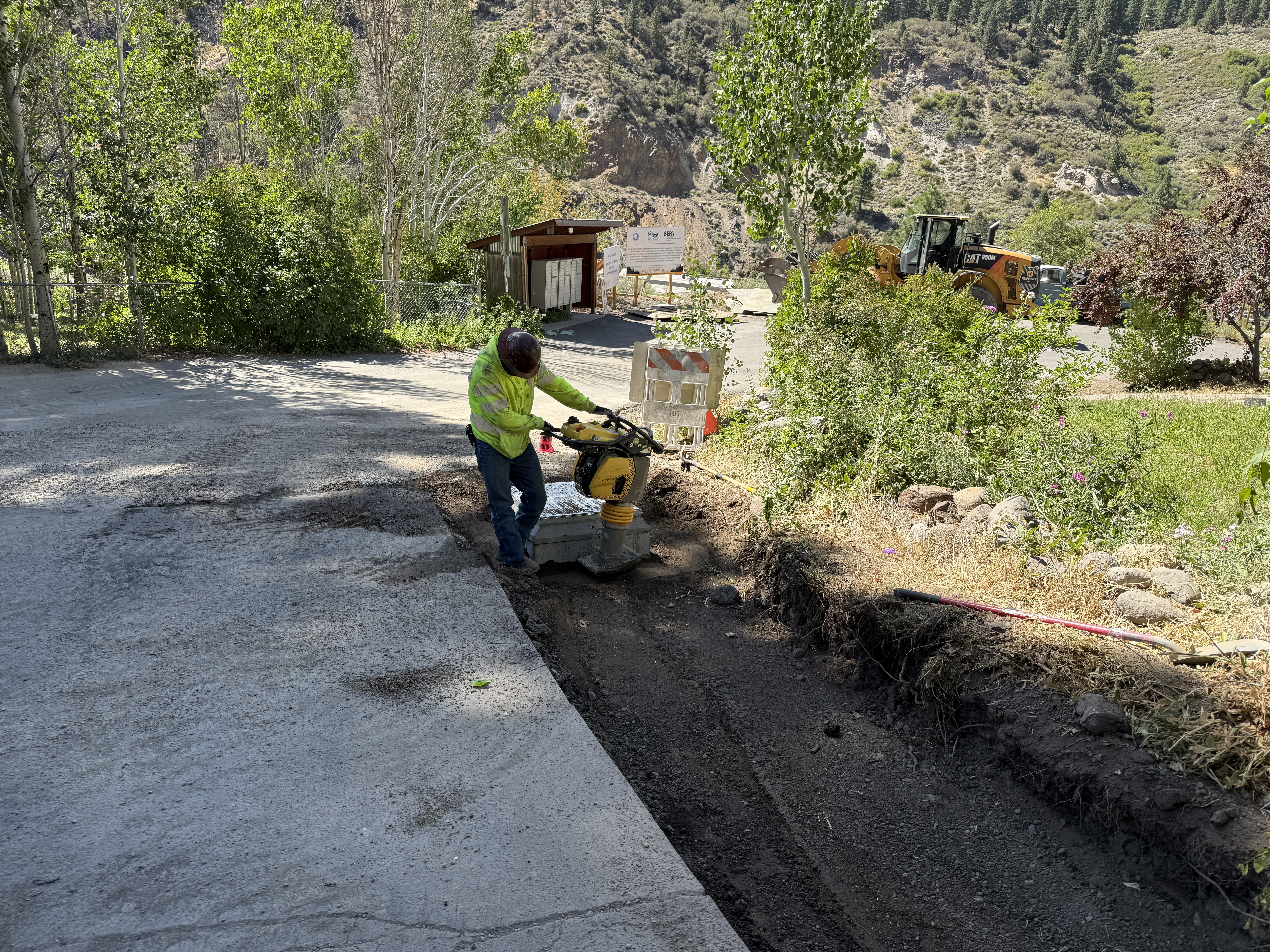 The image shows a worker in a hi-vis vest using a compactor on the edge of a trench next to a pavement. A loader is visible in the background, indicating active work in the area. Surrounding vegetation suggests a rural or semi-rural setting. The trench runs parallel to the pavement, with loose soil evident along its edges.