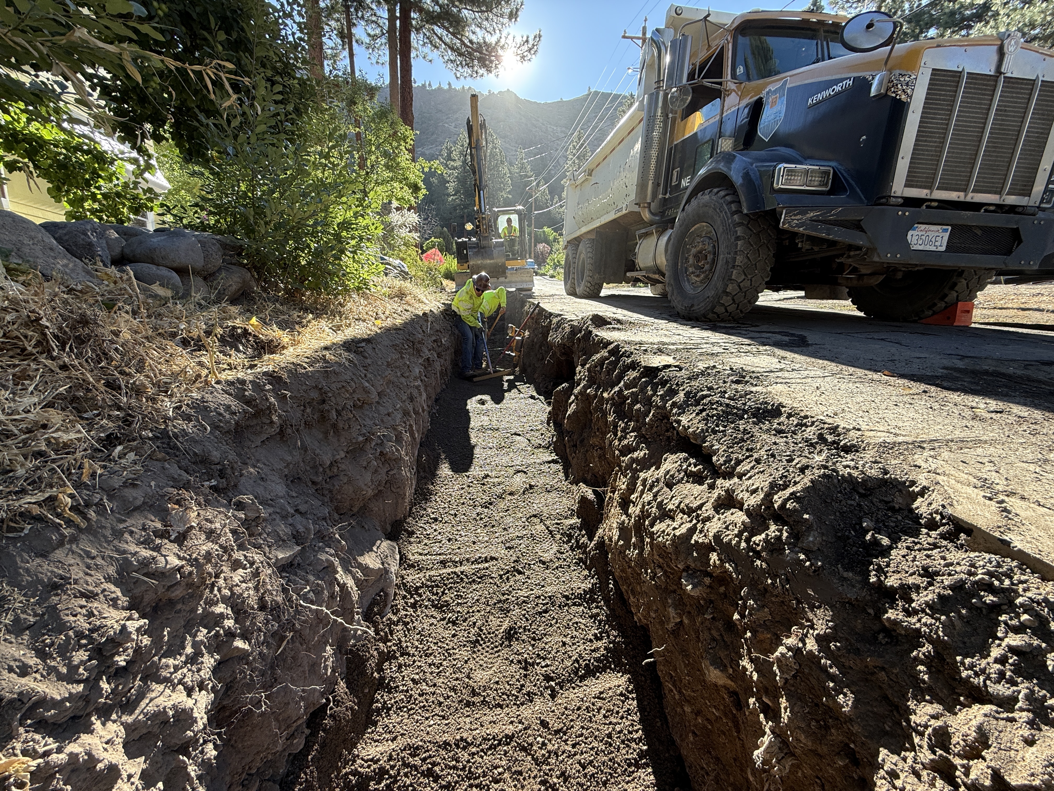 The image shows a trench being excavated along a roadway with a dump truck parked at the edge of the trench. An excavator is visible at the far end, apparently engaged in the trenching activity. Workers are present in the trench, and the trench walls appear clay-like. The weather is clear with strong sunlight casting shadows.