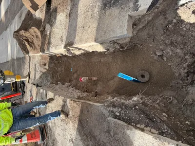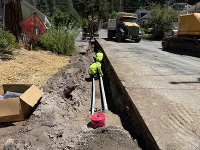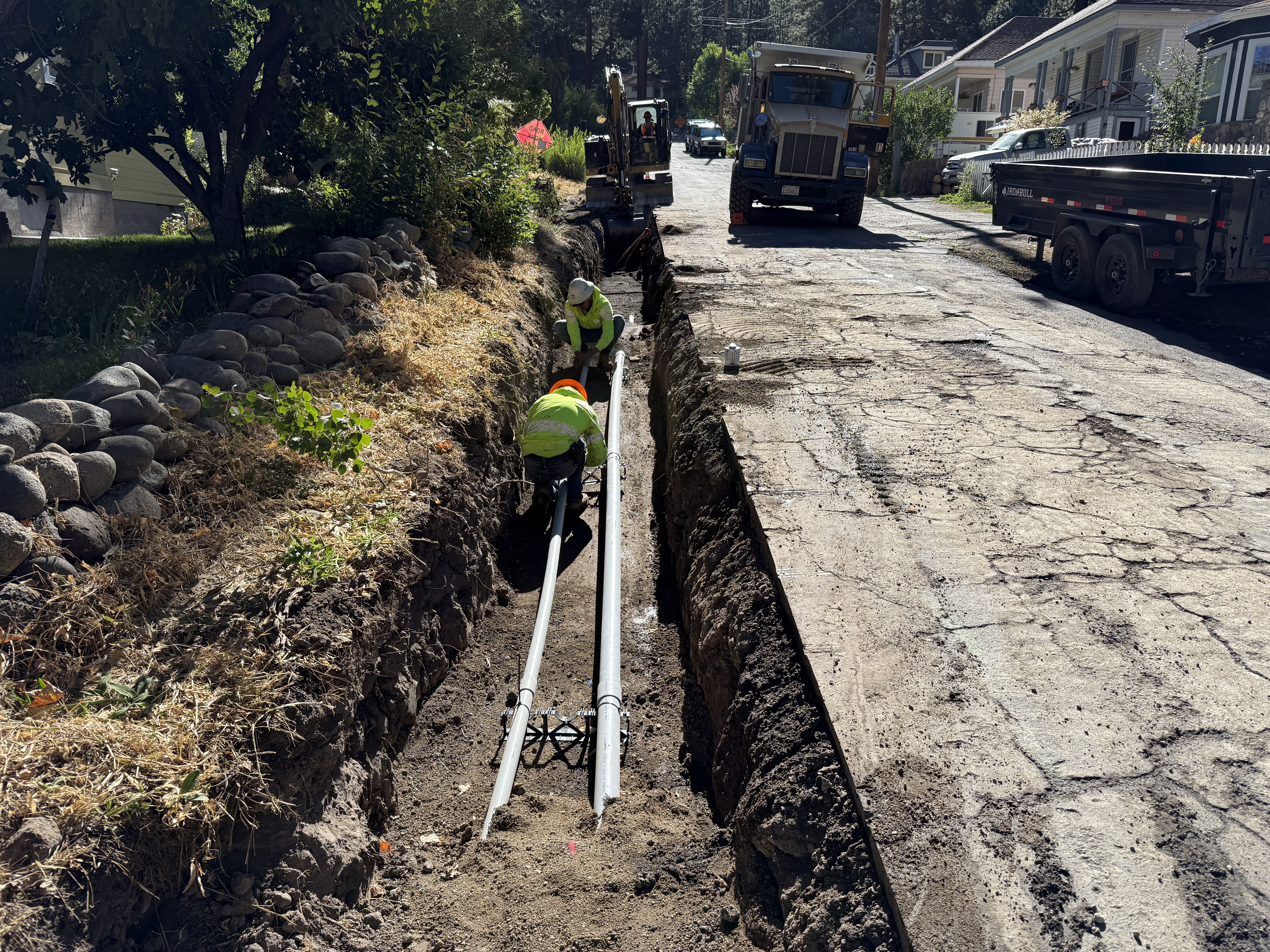The image shows an open trench along a road where two construction workers are installing conduit pipes. The trench is lined on one side with rocks, and there's visible machinery, including a truck and an excavator further down the road. The workers are wearing high visibility vests and hard hats. The surface is a combination of soil and pavement, with the trench clearly excavated along the side of the road.