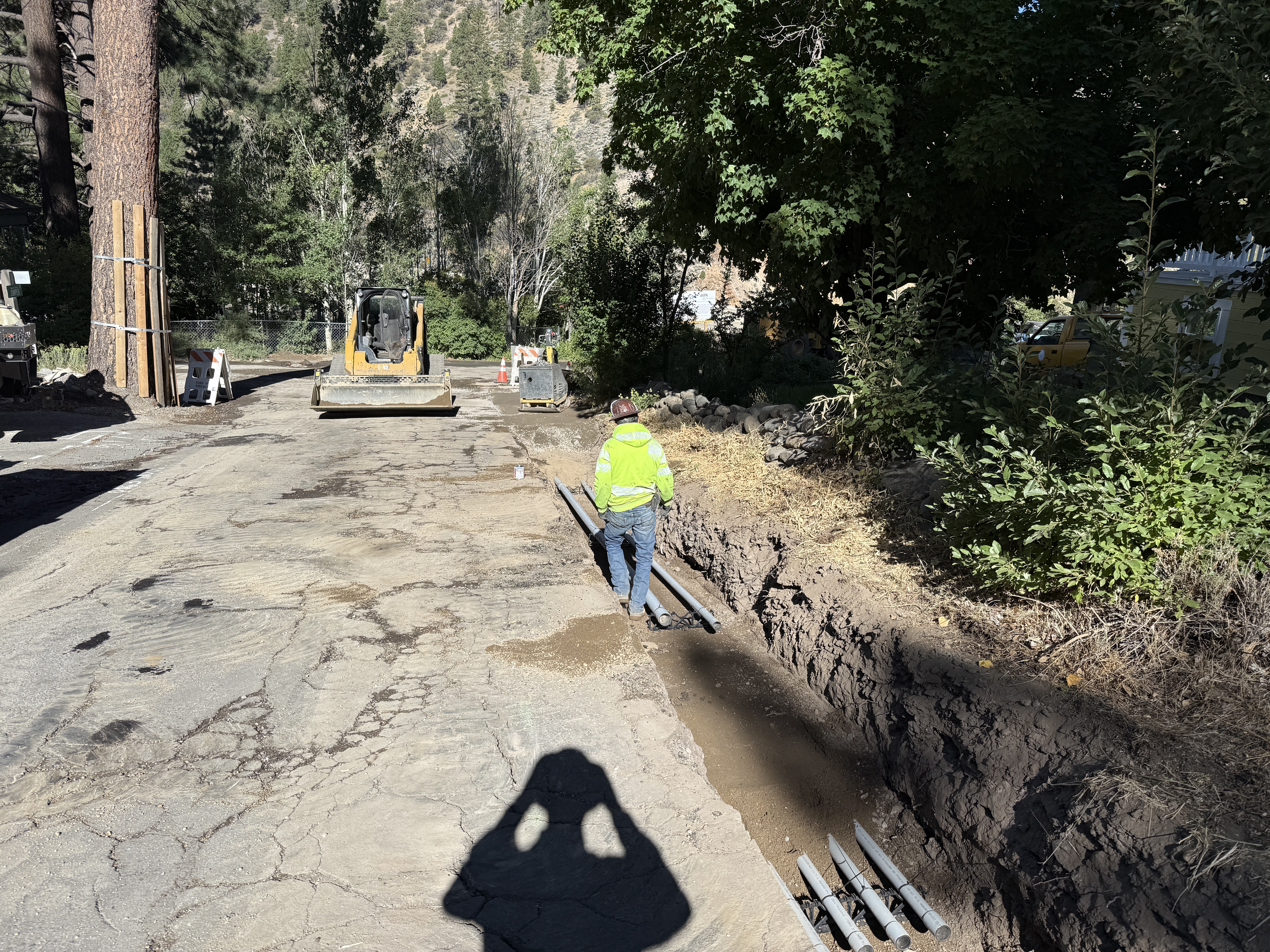 The image shows a construction worker in a hi-vis vest and hard hat examining an open trench on a cleared section of pavement. Several conduit pipes are laid in the trench. A compact track loader is parked on the cleared road surface beside the trench. The area is surrounded by trees, with materials and equipment staged nearby.
