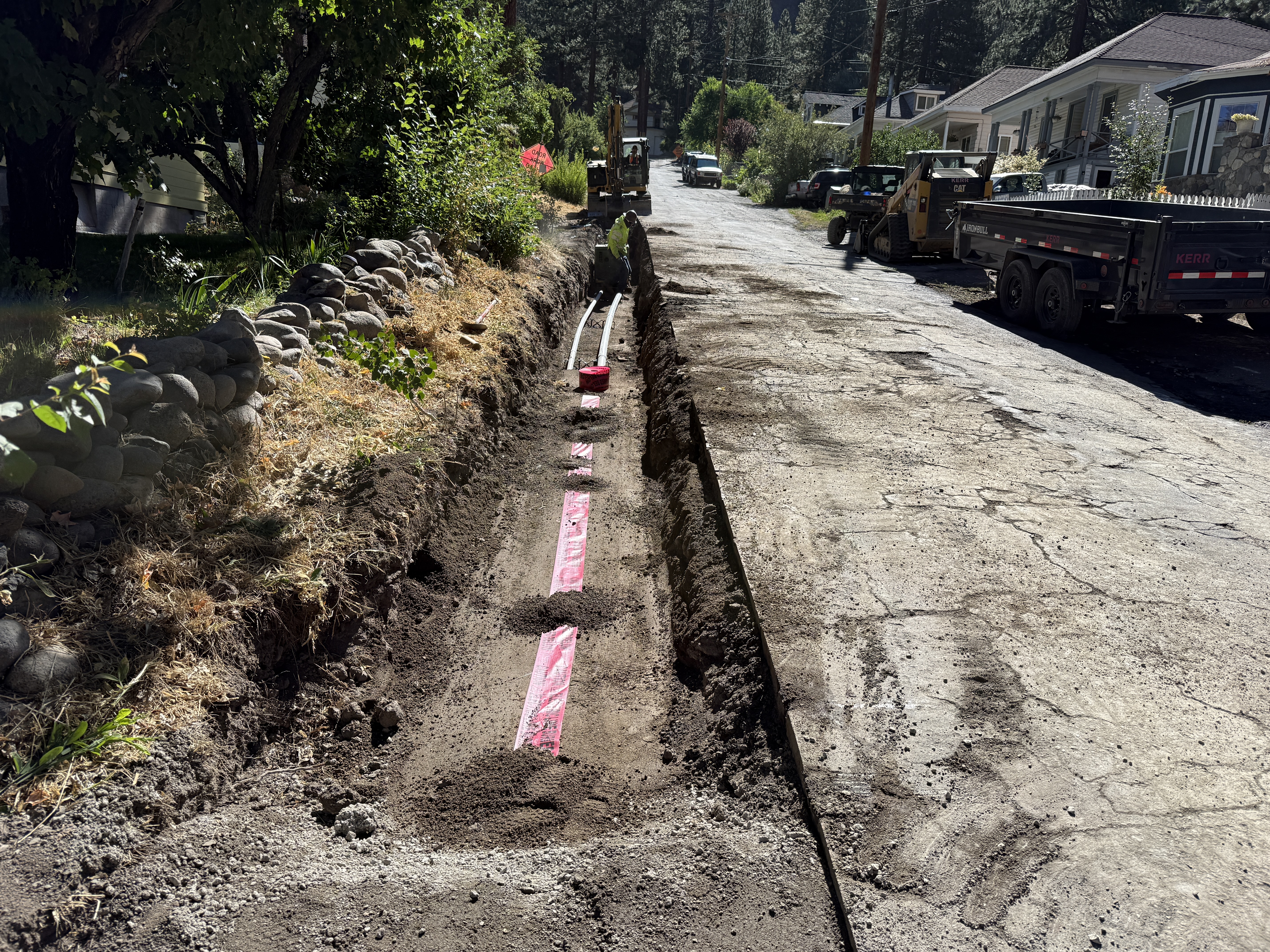 pavement alongside trench sunny conditions accessible roadside with equipment positioned