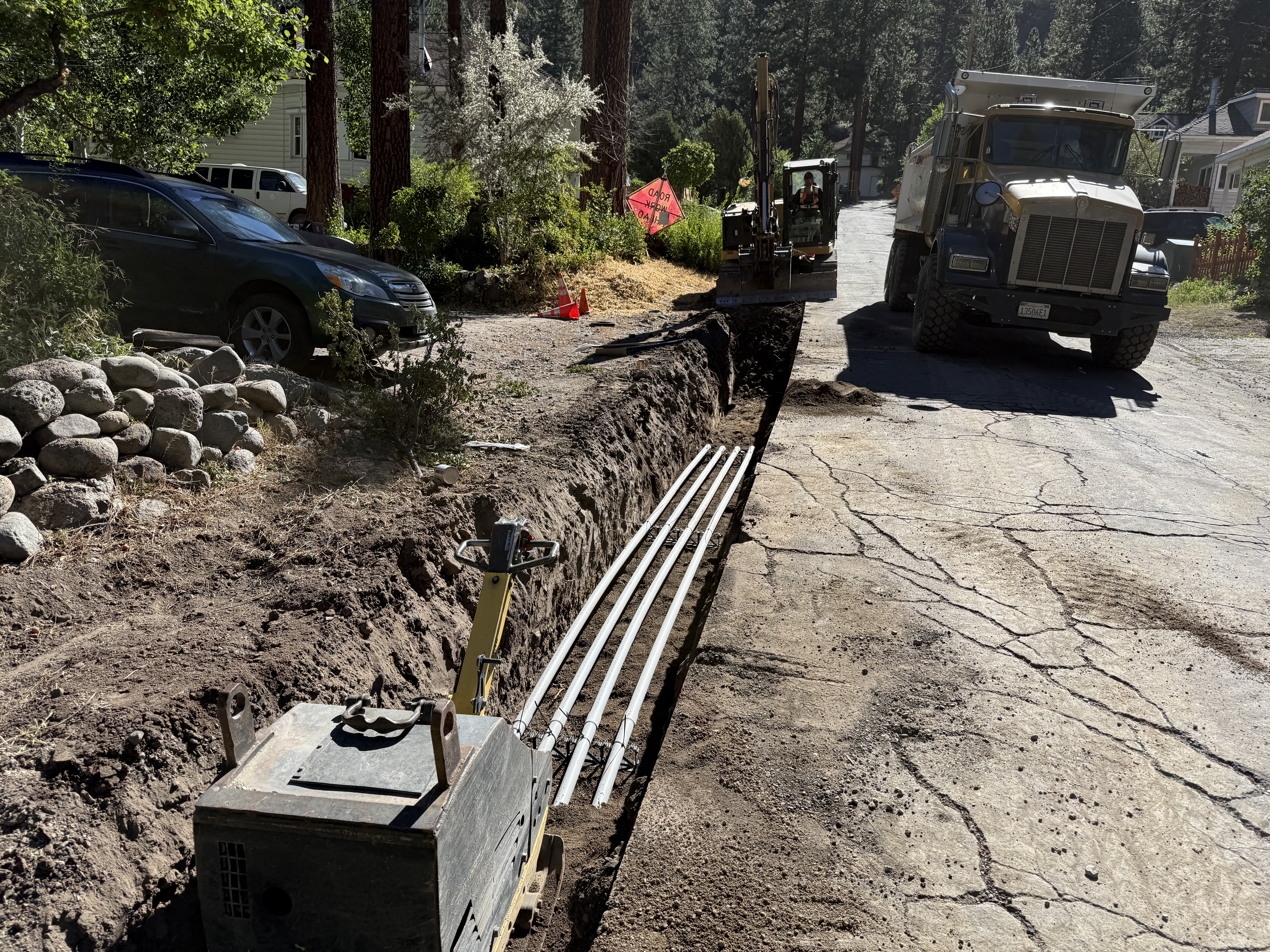 The image shows an open trench alongside a road with multiple parallel PVC conduits laid inside. A piece of heavy equipment, likely an excavator, is positioned on the road next to the trench, along with a truck. The trench appears to be for electrical or communication duct bank work.