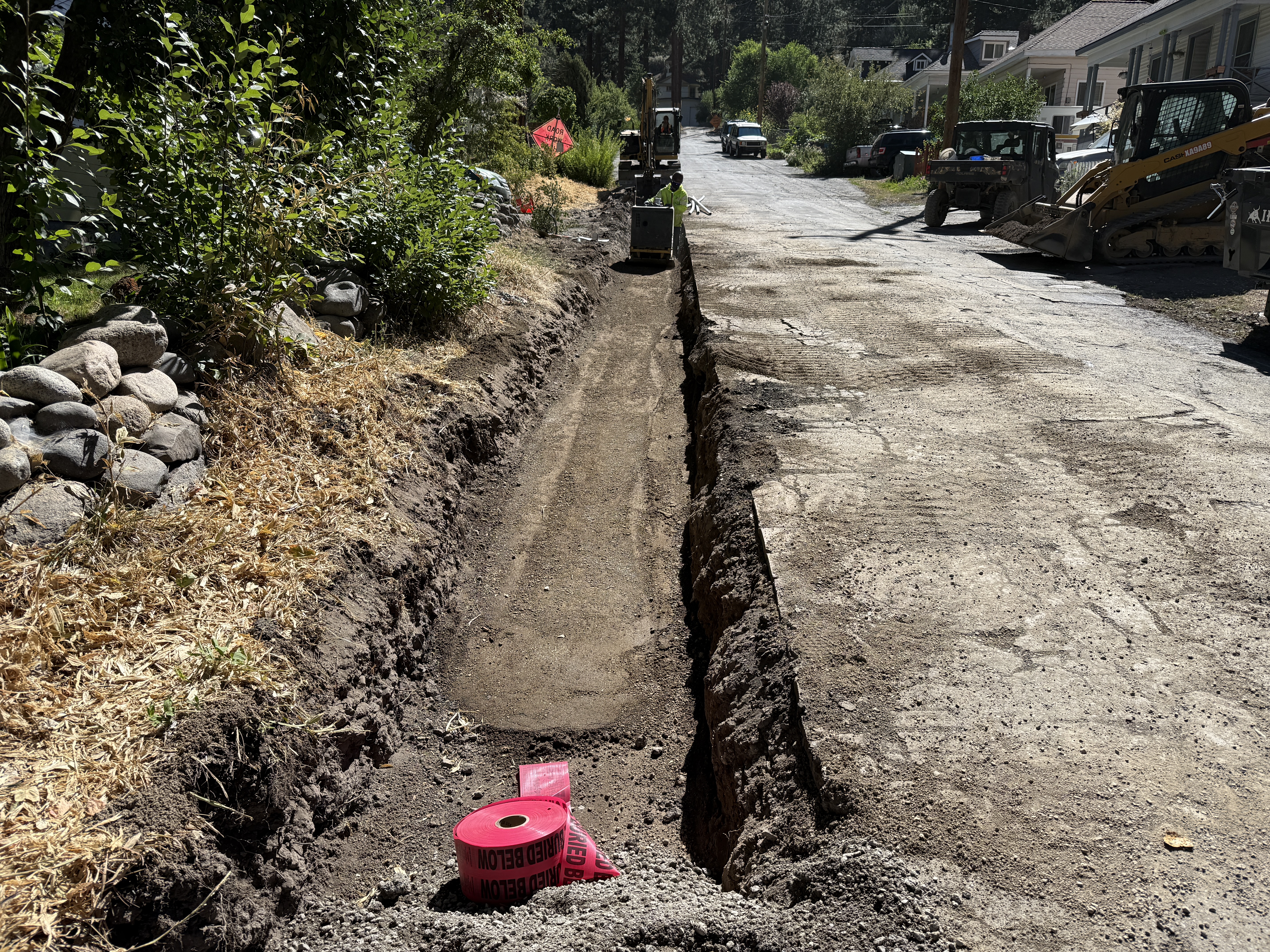 pavement and soil alongside trench daylight with good visibility equipment and vehicles staged along the road